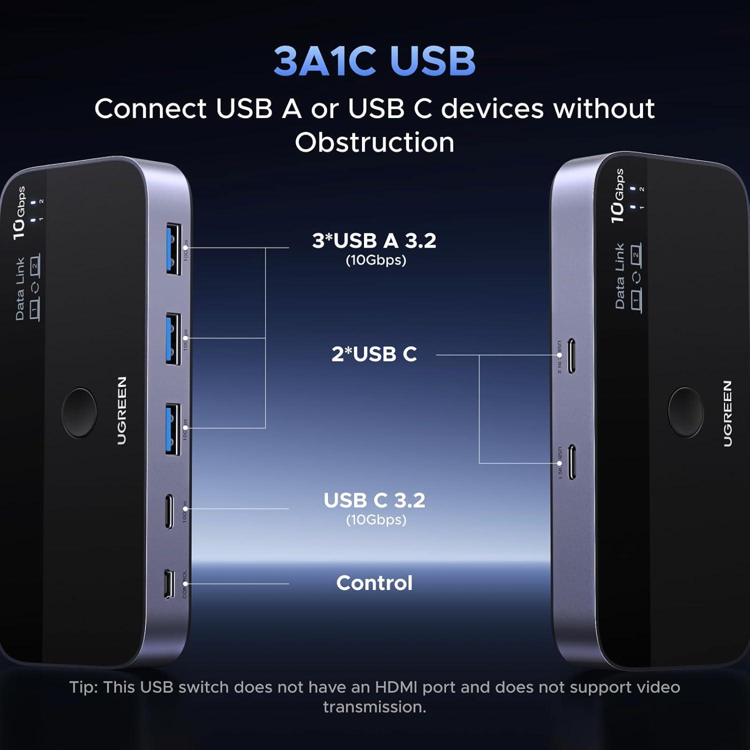 UGREEN 10 Gbps USB-C Switch Support File Sync & Cross-Screen Drag, USBC 3.2 Switch 2 Computers Share 4 USB 3.2 Gen 2 Ports, USB Switcher Selector Sharing Keyboard and Mouse with Controller