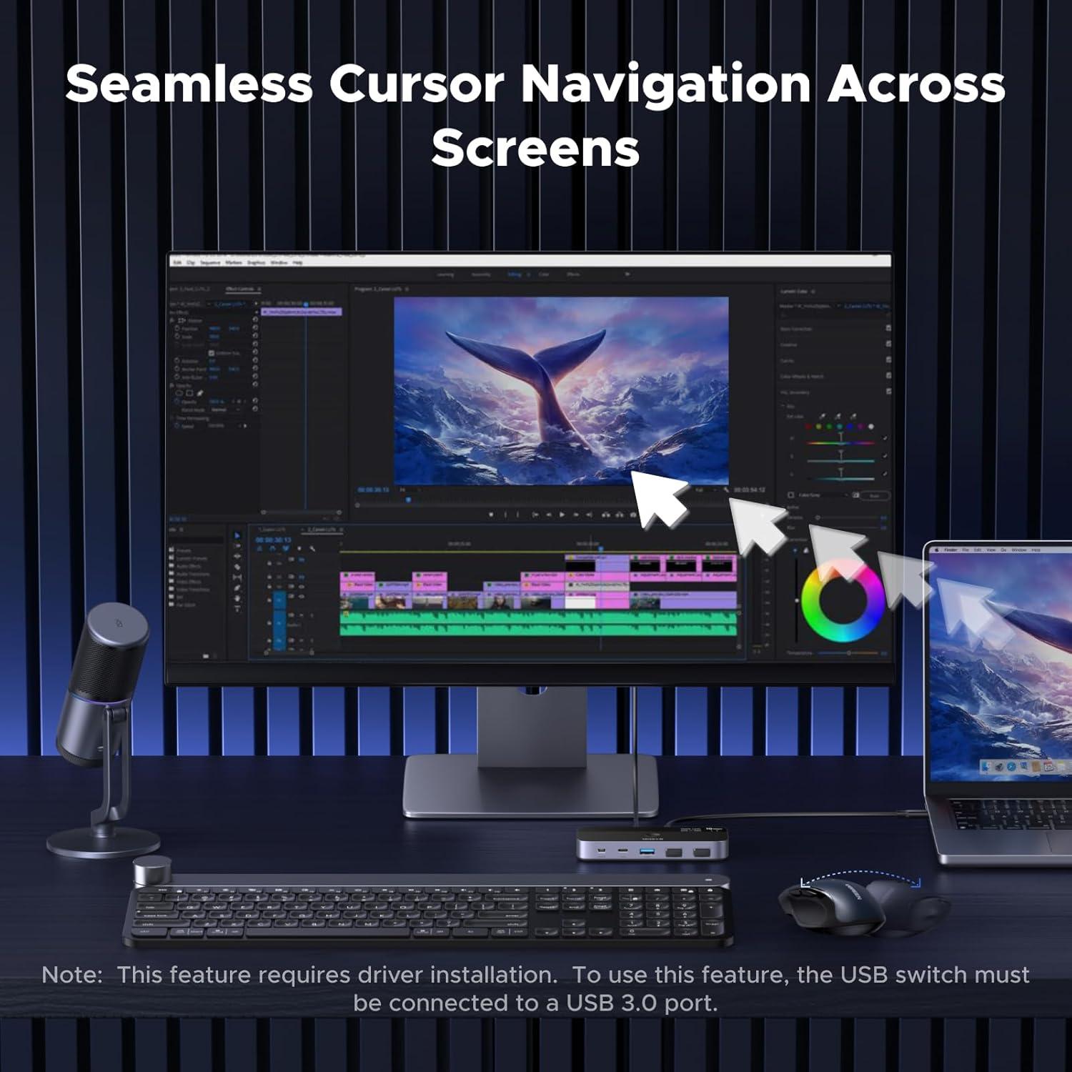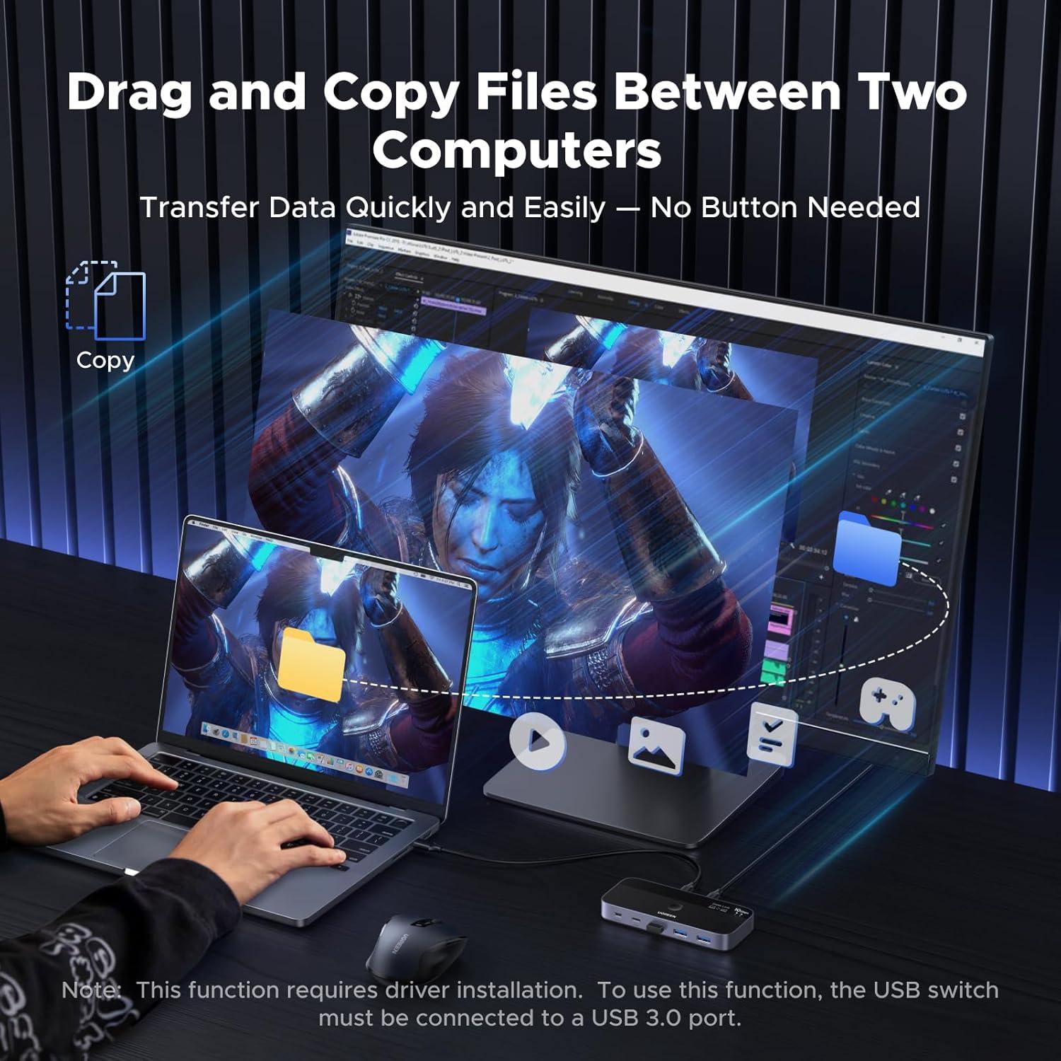 Support File Sync & Cross-Screen Drag: This USB-C switch allows seamless file sync, drag & drop, and clipboard sharing between two computers — Streamline your workflow, no more switching USB drives or uploading to cloud storage. (Function depends on system compatibility and mainly works via keyboard and mouse; others do not support such functions. And these features require driver installation.)