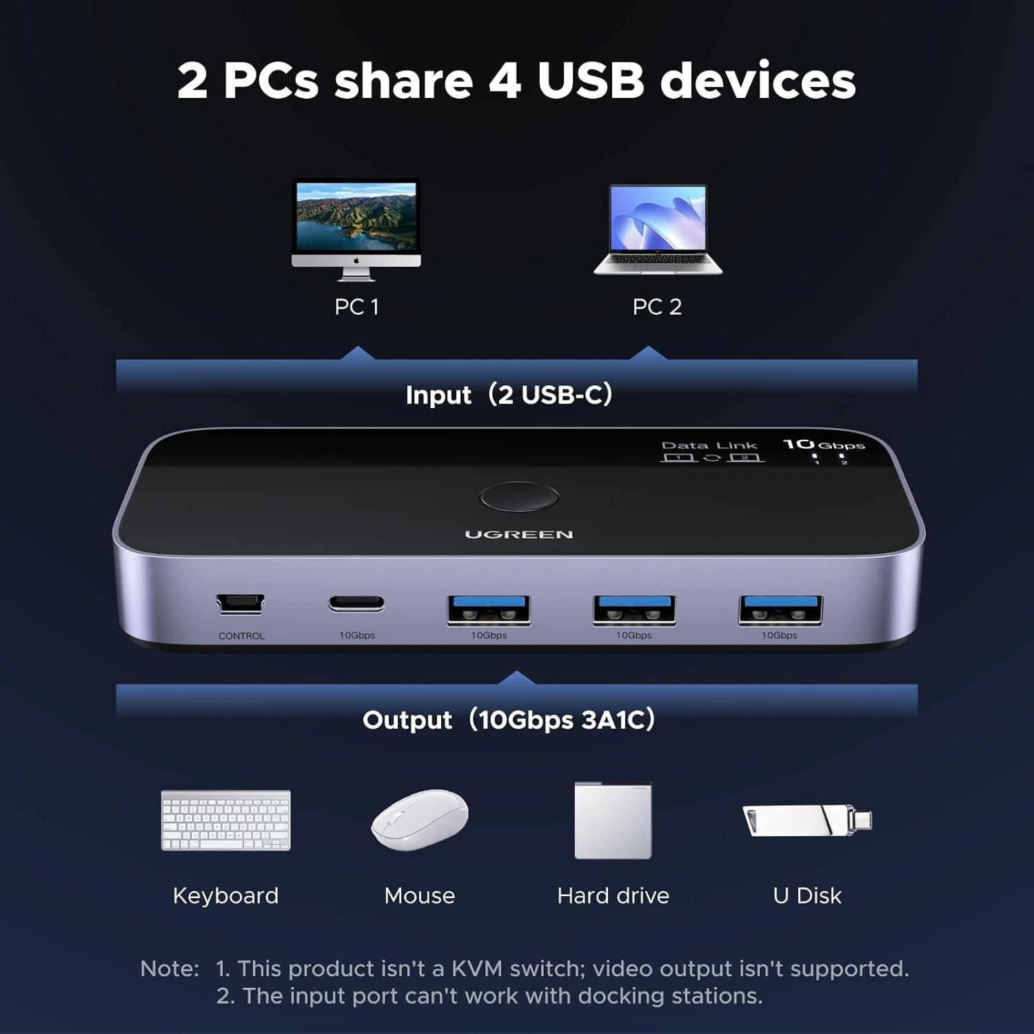2 USB-C PCs Share Multiple Devices: UGREEN 2-In 4-Out USB-C switch supports sharing 4 USB devices like a keyboard, mouse, and headphones between 2 computers. Switch freely between work computer and personal laptop to boost work efficiency. (Not a KVM switch and Not support a monitor)