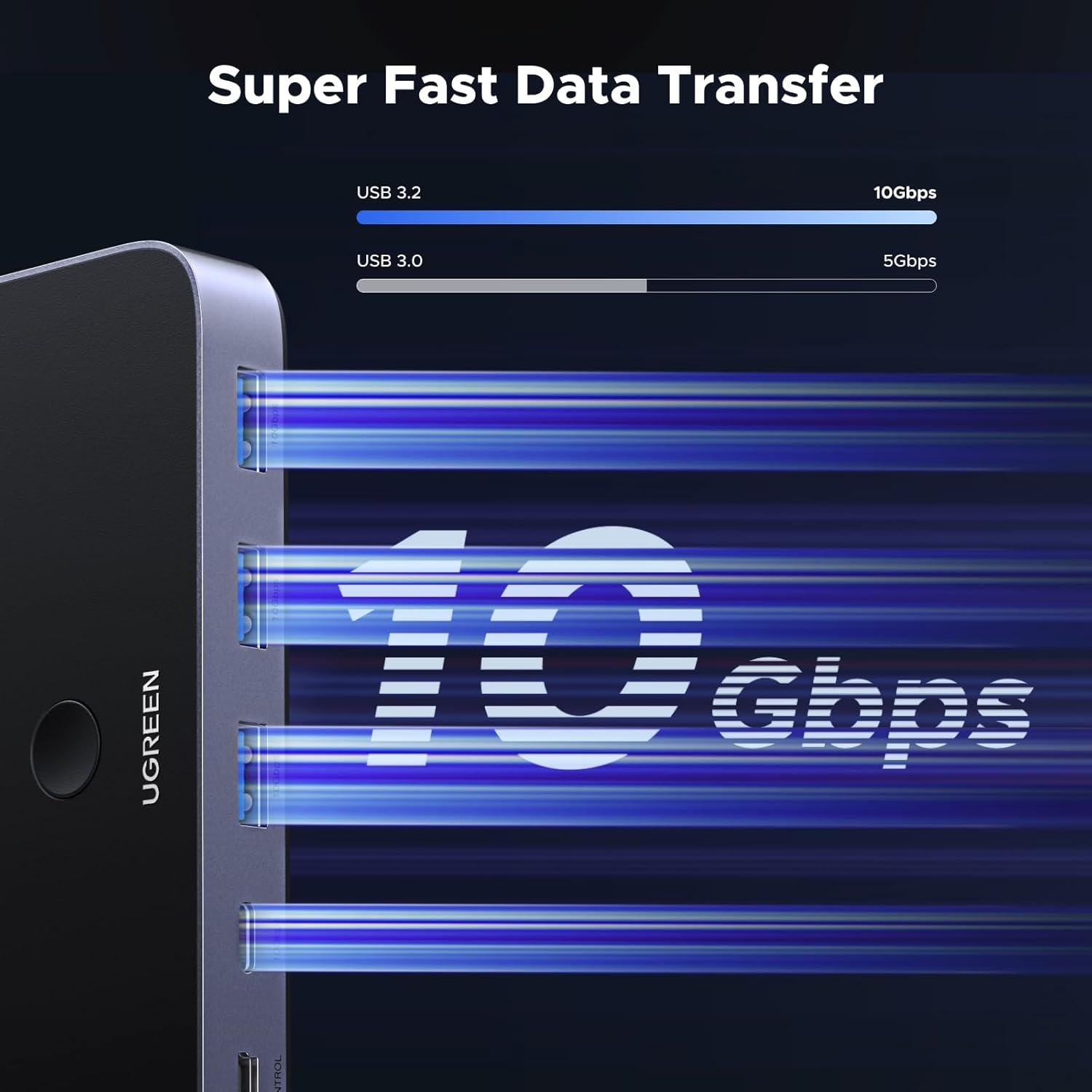10 Gbps Transfer Speed: The USB-C switch is equipped with 4 USB 3.2 Gen 2 ports and speeds up to 10 Gbps. Faster than traditional 5 Gbps USB Switches, transfer 1 GB files in 1.5 seconds to improve work efficiency without waiting. (The USB ports are primarily for data transmission — audio connections and charging are not recommended.)