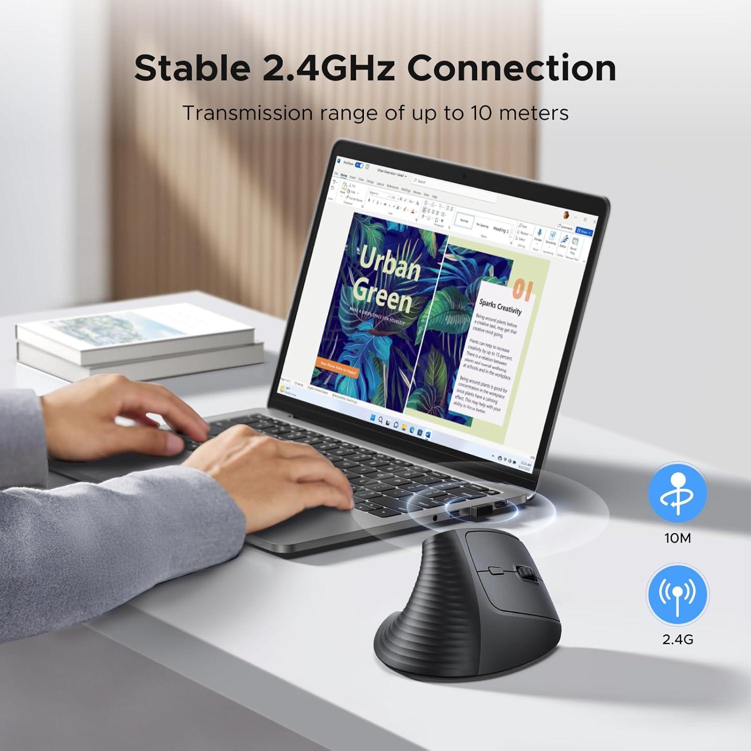 Wireless freedom: The UGREEN vertical mouse has a maximum working distance of 10 m, so you are no longer restricted by cables.