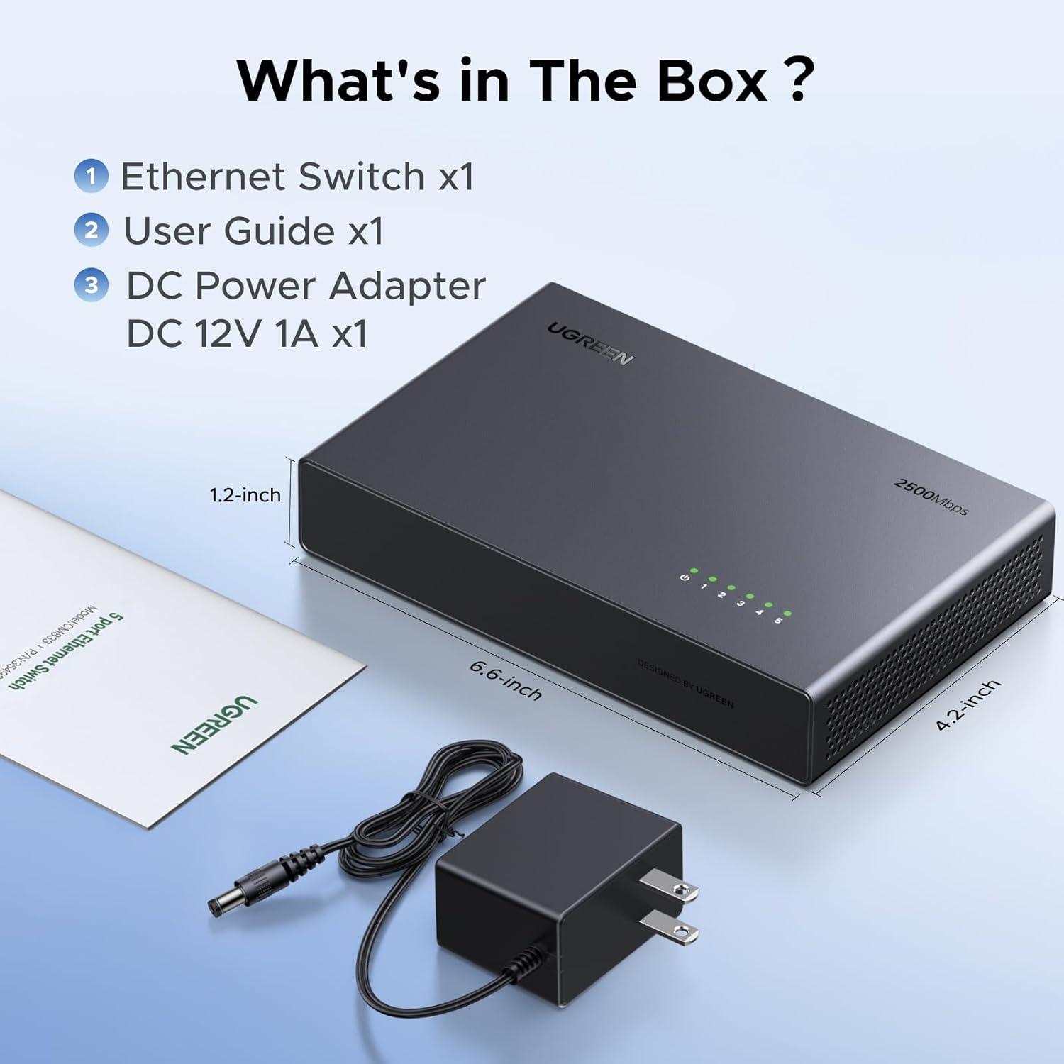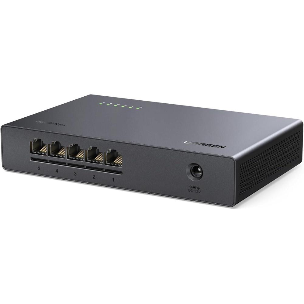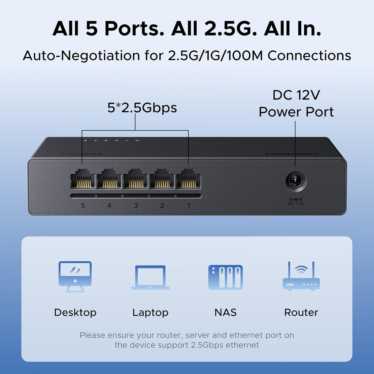 Unleash 2.5Gb on Every Port: UGREEN 2.5Gb switch features 5 x 2.5Gb ports deliver up to 25Gbps switching with smooth, non-blocking performance. Auto-negotiation makes it plug-and-play and fully backward compatible with 1000Mbps and 100M devices