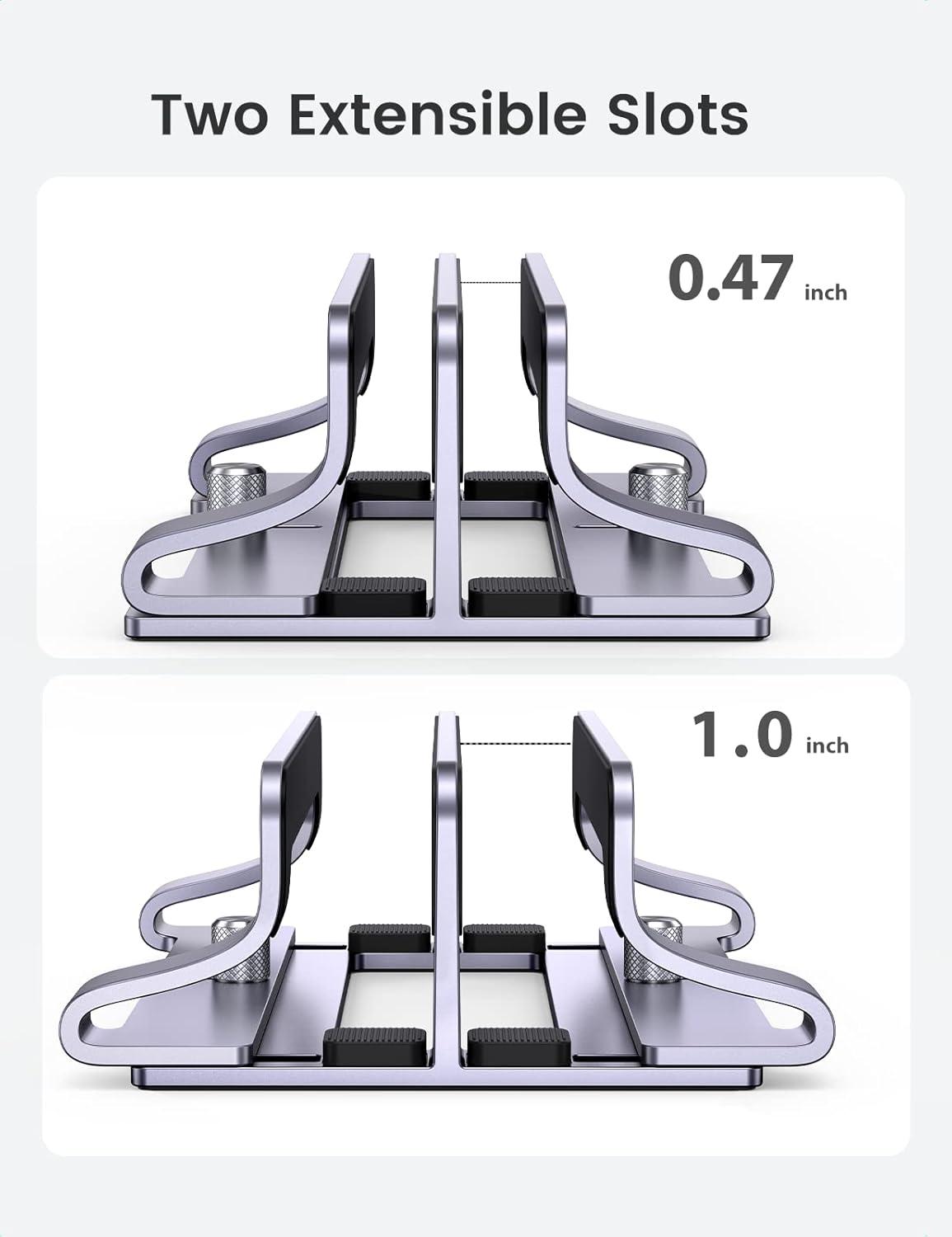 Dual Slot Design: The vertical laptop stand holds laptop when it's connected to monitor or simply for storage. With updated dock version, the double laptop stand holds two laptops simultaneously in upright position to optimize and organize desktop space
