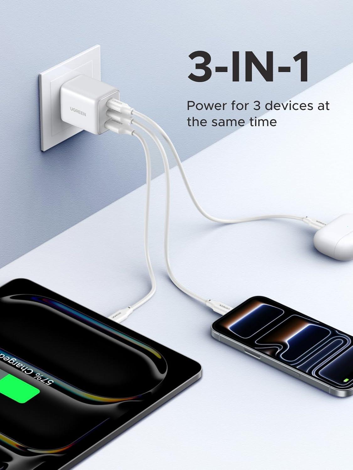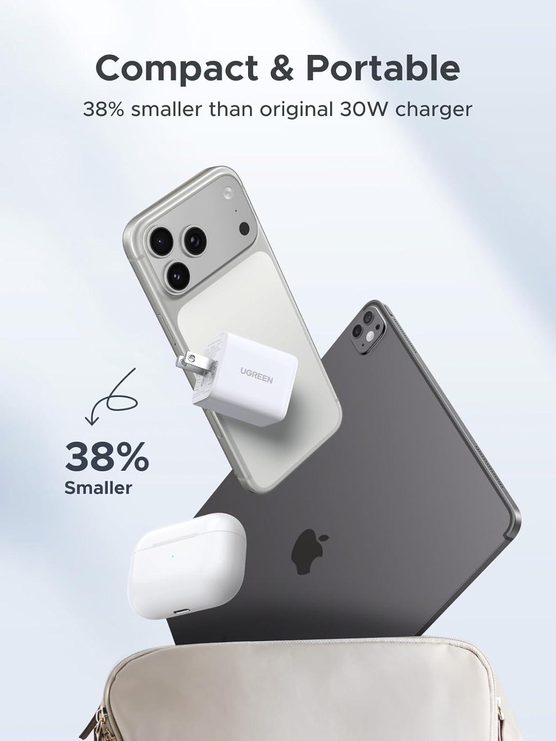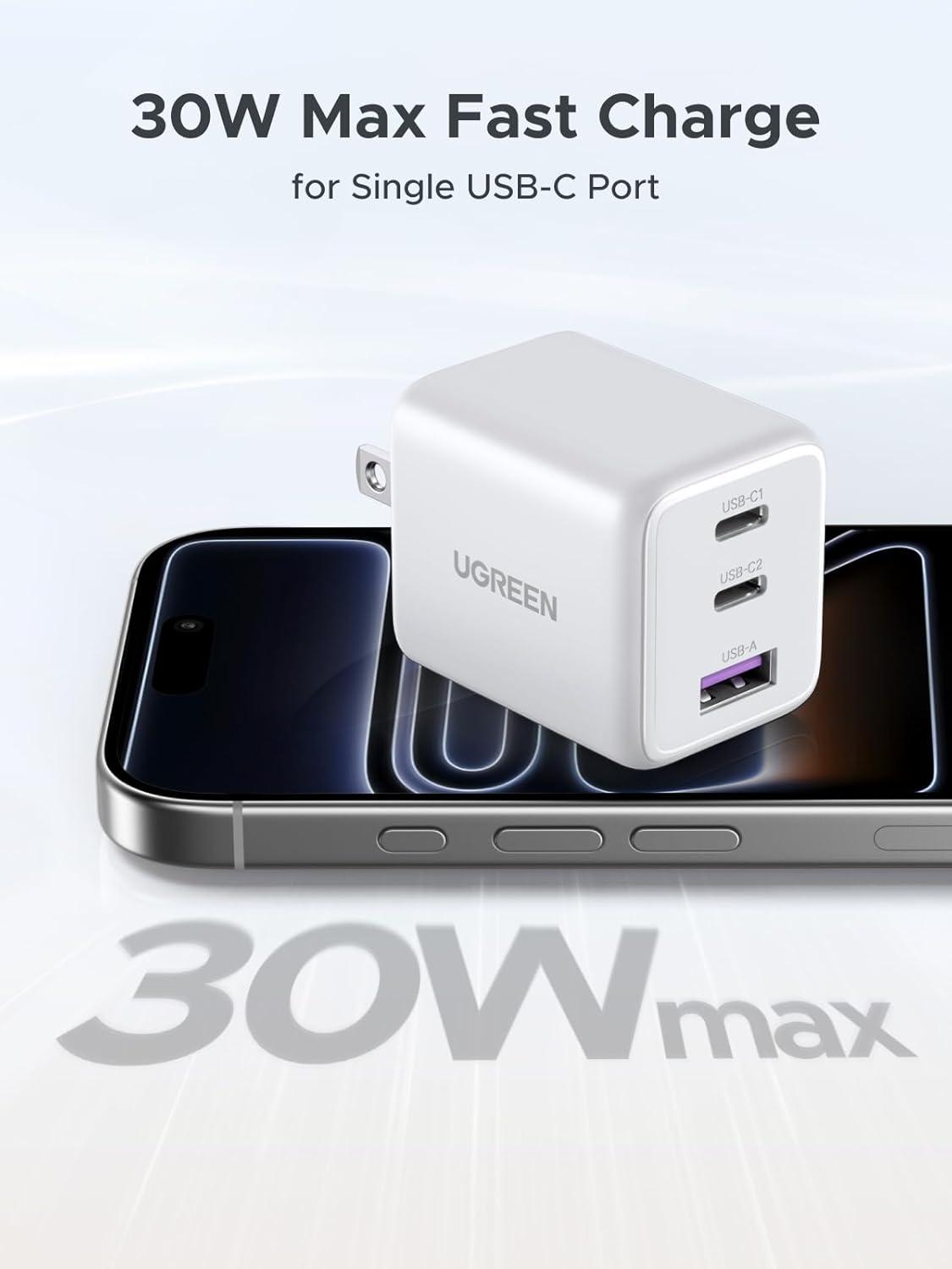 UGREEN 3-Port 30W USB C Charger, GaN II Compact iPhone Charger Fast Charging, Type C Power Adapter for iPhone 17/16/15 Series, Samsung Galaxy S25/24/23, iPad, Matt Black(White)
