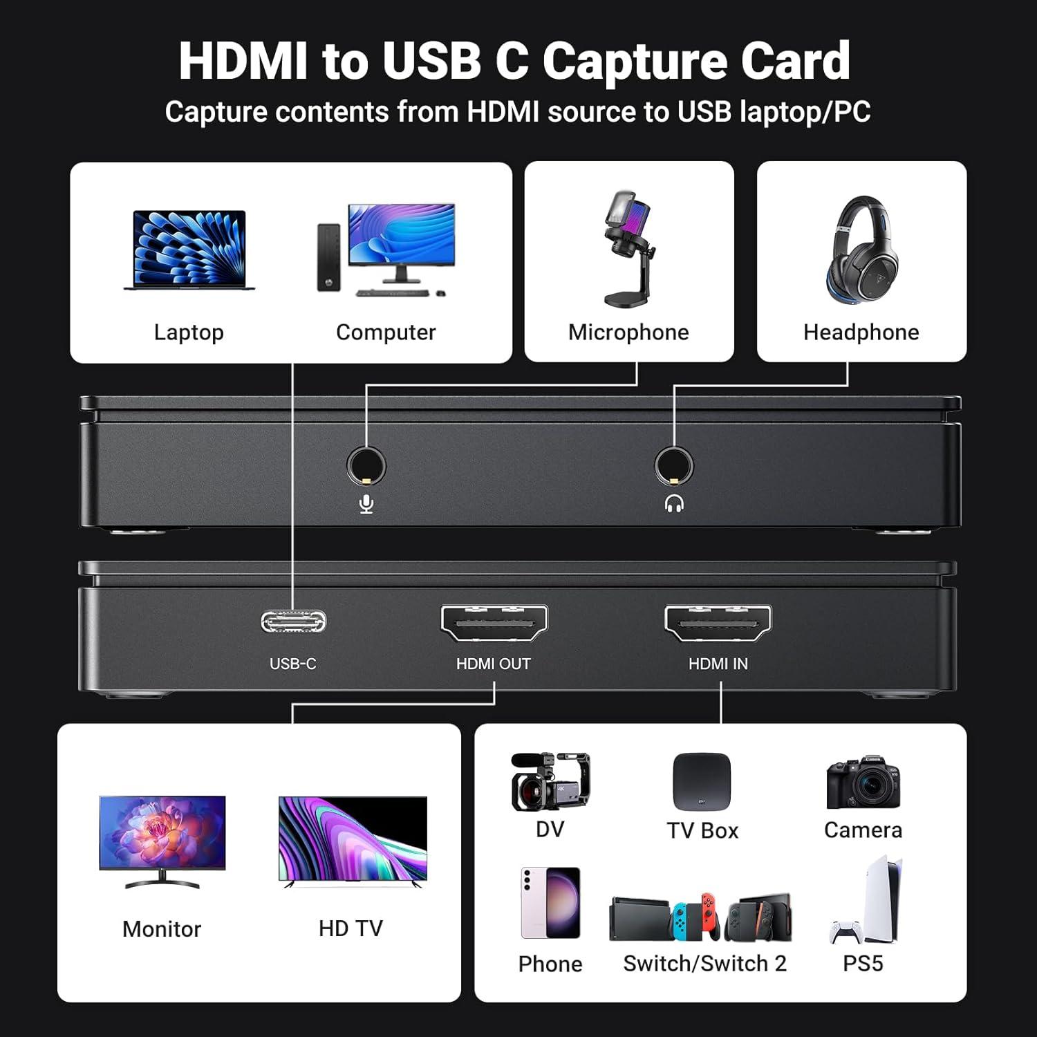 Compatible with Various Systems: The video capture device has wide compatibility, and is compatible with Windows, Mac OS, Linux, iOS17, and Android systems. Easy to record and stream video from Nintendo Switch/PS4/PS5/Xbox Series X/Meta Quest 3/2 to iPad/Laptop/PC. The capture card is suitable for live streaming, recording, editing, and transferring high-resolution video on OBS, XSplit, Potplayer, and more