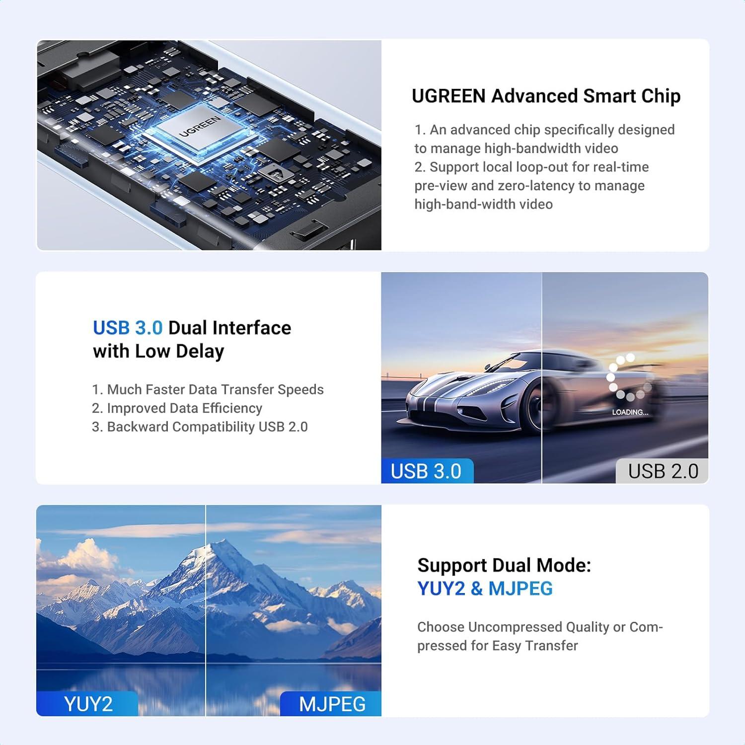 UGREEN 4K@30Hz HDMI Capture Card, Full HD 2K 30FPS, 1080P 60FPS, HDMI to USB 3.0 HDMI Loop Out Video Capture Card with Low Latency for Streaming Gaming, Compatible with Switch 2/PS5/Xbox/PC/Mac