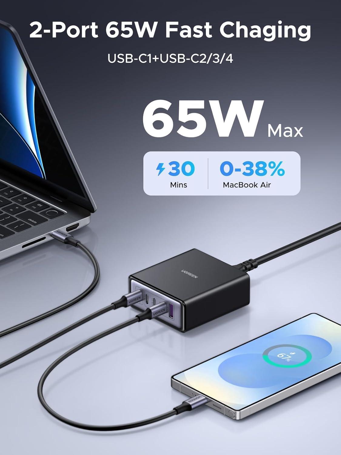 High-Power 65W Output — Delivers up to 65W total power, including a 45W max output from one USB-C port for fast charging your primary device while powering additional gadgets.