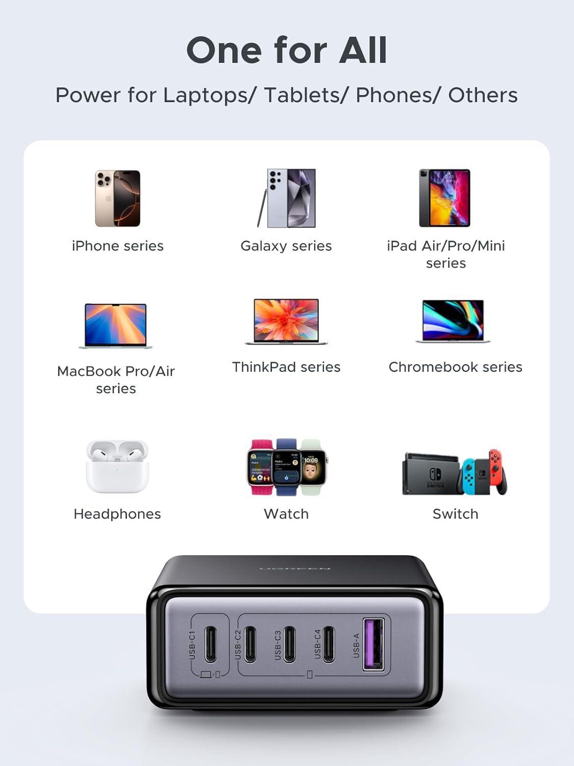5-Port Charging Hub — Equipped with 4 USB-C and 1 USB-A ports, allowing simultaneous charging of your smartphone, tablet, laptop, and accessories without throttling.