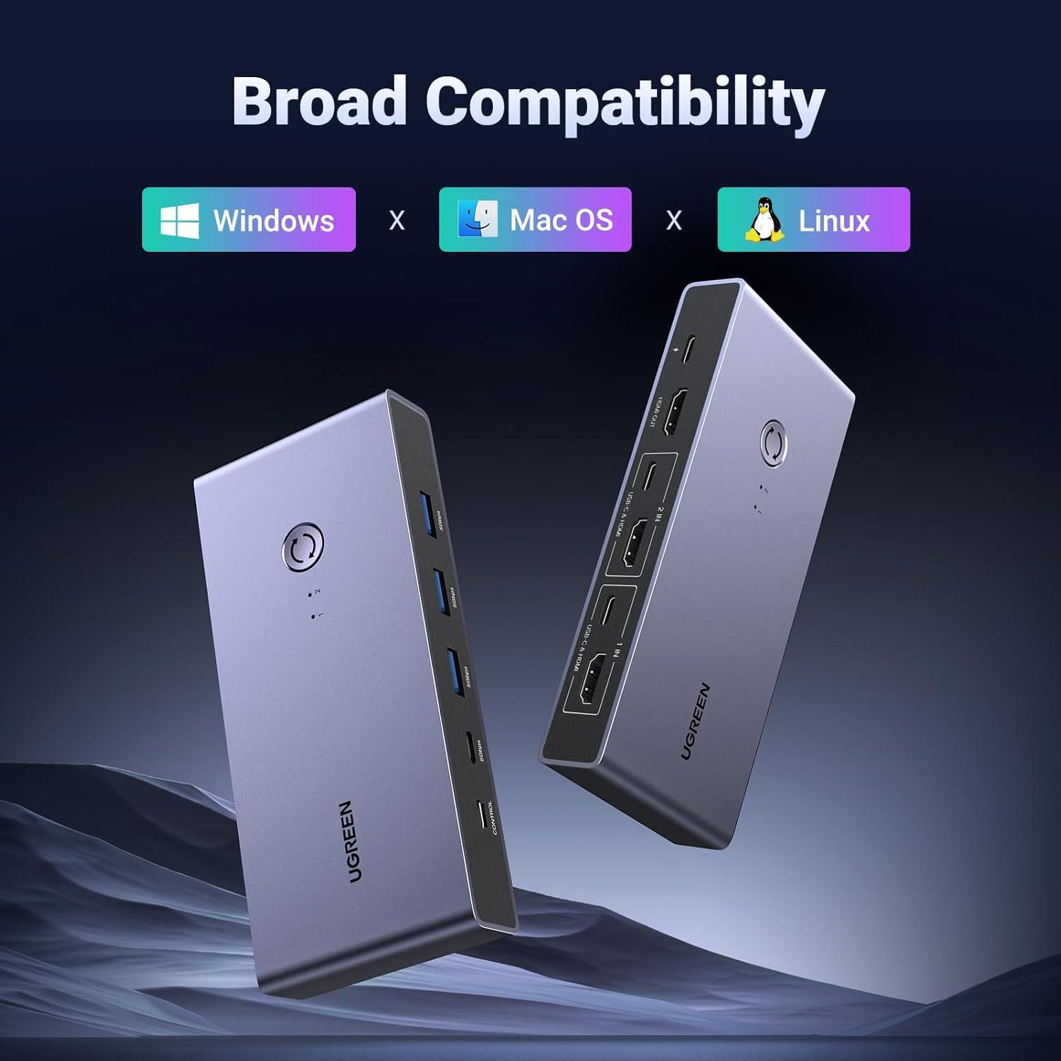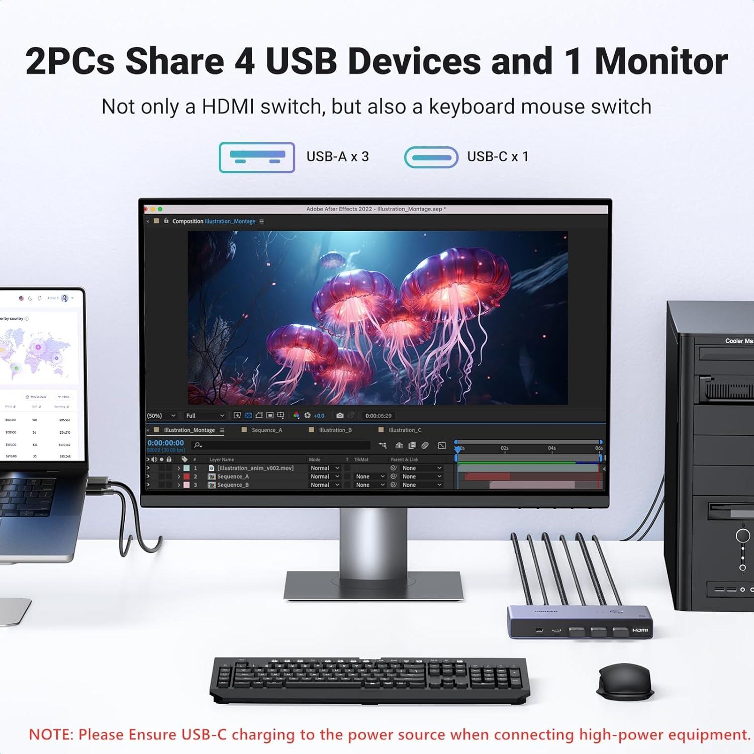 UGREEN 8K HDMI KVM Switch with 4 USB 3.0 Ports (3 USB-A + 1 USB-C) for 2 Computers Share 1 Monitor Keyboard Mouse Hard Drives Printer with 2 HDMI Cables, 2 USB Cables and Controller