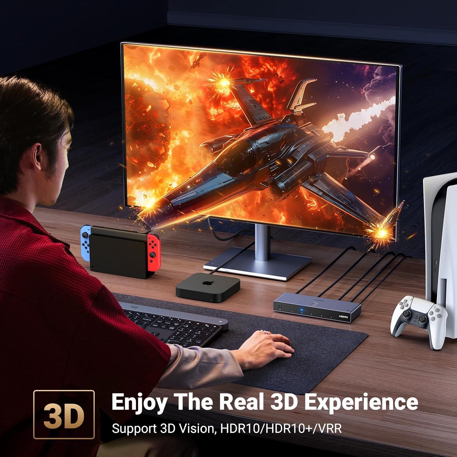 HDMI Switch 5 In 1 Out: Are you tired of constantly switching among multiple devices on your TV? UGREEN HDMI switch with remote makes it a breeze! Connect 5 of your devices such as PS5, Xbox, Switch, Roku, and laptop to your TV with just one input port, and seamlessly switch between games, movies, and TV shows. It will help you expand HDMI ports on your TV, no need to switch devices by plugging and unplugging the HDMI cables