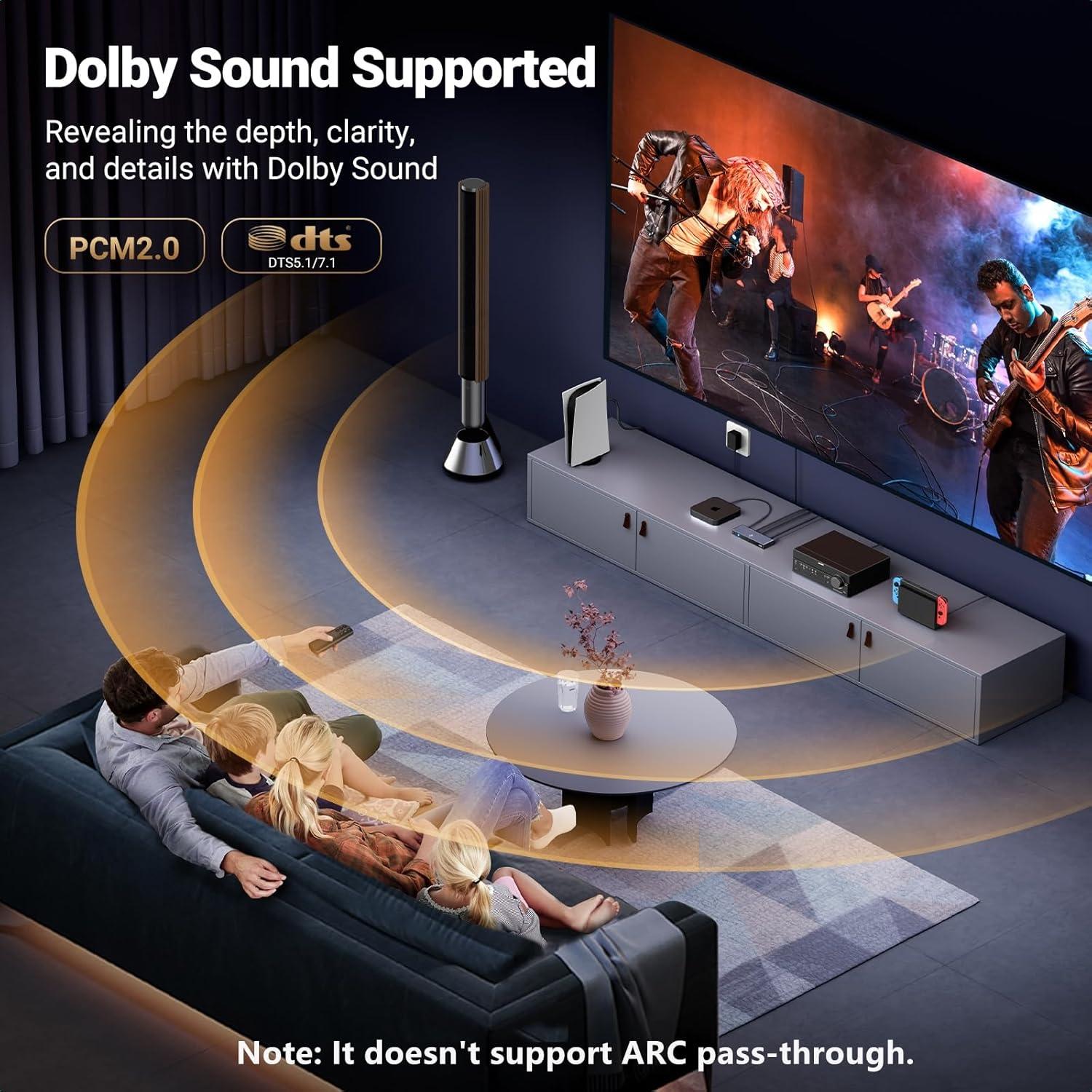 Ultra-HD 8K@60Hz Resolution: Our HDMI splitter is perfect for gamers, supporting the latest 8K@60Hz, backward compatible with 4K@60Hz and 1080P@240Hz and below. It also supports HDMI 2.0/1.4, 3D Dynamic HDR 10+ Dolby Atmos, and HDCP 2.3. NOTE: To ensure the high refresh rate (8K@60Hz), the length of your HDMI cable at the input should be within 1m, and the length at the output should be within 2m