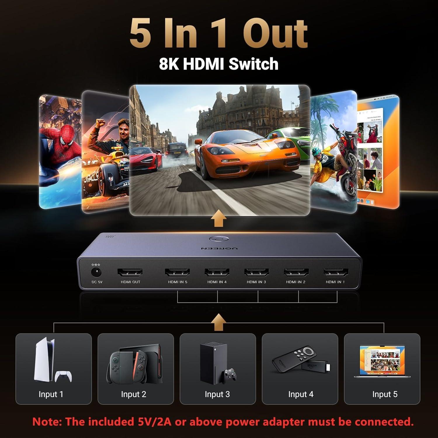 UGREEN 8K@60Hz HDMI Switch 5 in 1 Out Aluminum Support 4K@240Hz HDR10+ HDCP 2.3 CEC HDMI 2.1 Switcher Splitter with Power Adapter Compatible with PS5/4 Xbox Nintendo Switch Roku Apple TV Fire Stick