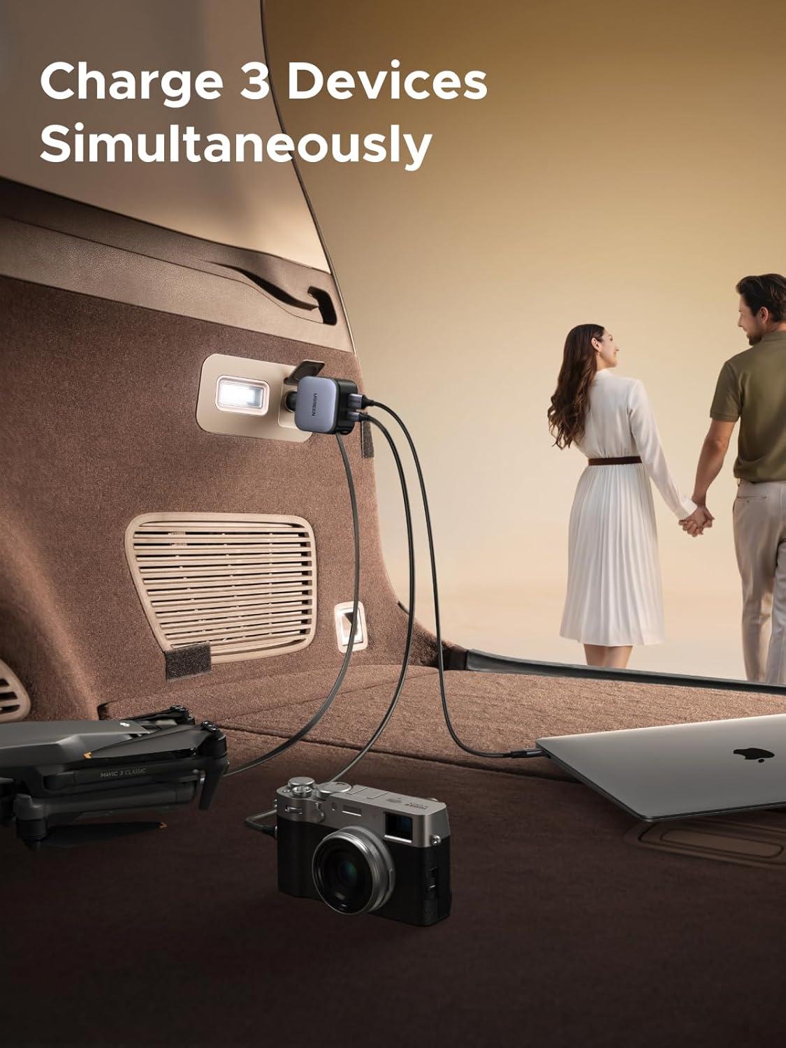 3-in-1 Multiple Functions: 90W car phone charger has multiple functions and can charge 3 devices simultaneously. Includes a retractable USB-C cable, a USB-C port, and a USB-A port. UGREEN retractable car adapter can intelligently adapt the output power based on the device's power requirements