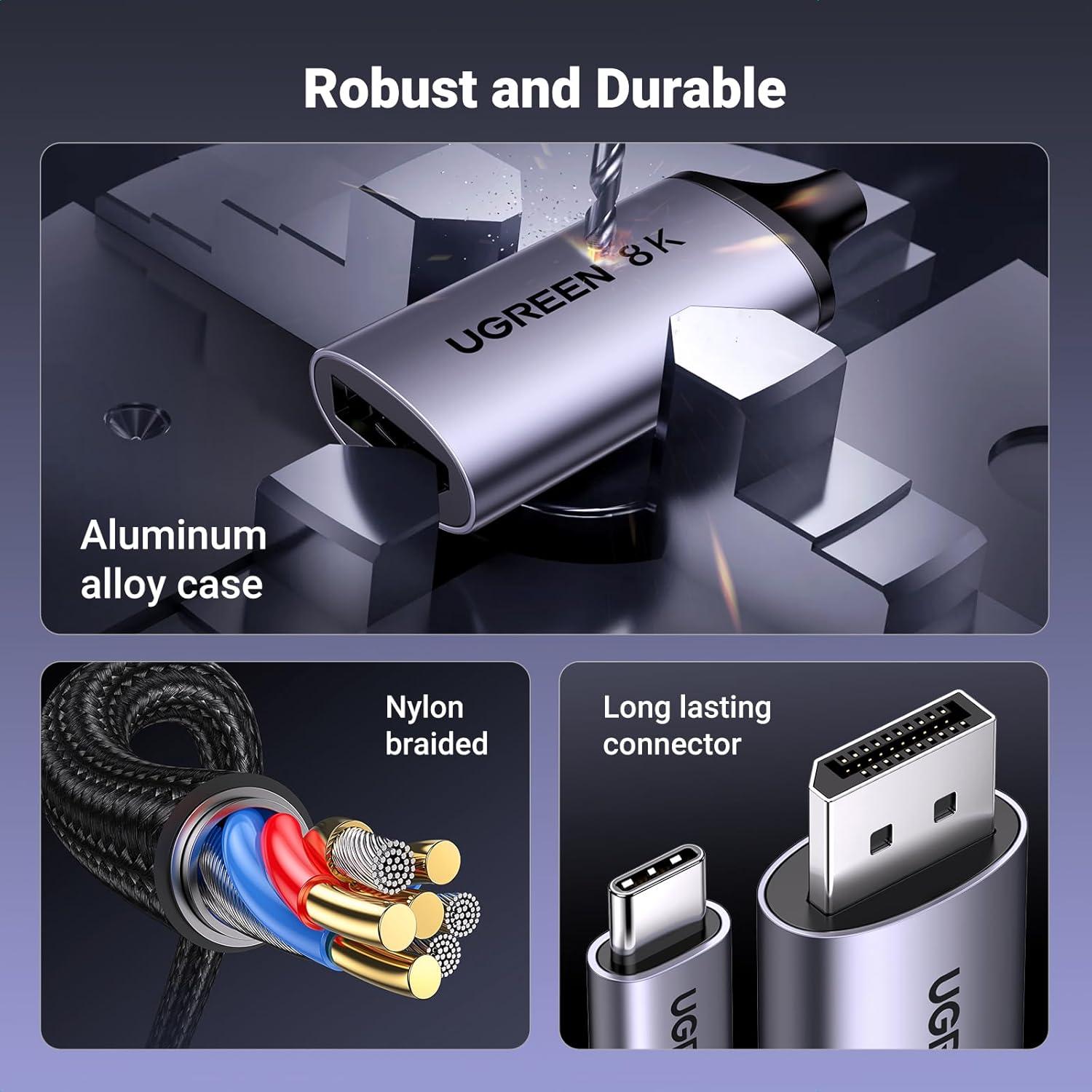 Nylon & Alu Case for Superior Durability: Braided nylon cable adds durability and strain relief making plug-and-unplug easier. Premium aluminum alloy case for greater heat dissipation. A thicker copper wire has maximum conductivity while minimizing signal loss. This DisplayPort to USB C cable has an extra Velcro tie for portability, making it the perfect length for home offices