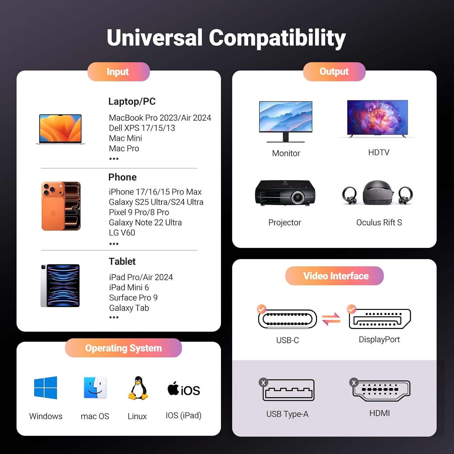 Universal Compatibility: Only for USB-C ports with video output function “DP Alt Mode” and Thunderbolt 3 & 4, the USB C to Displayport 1.4 cable is compatible with iPhone 17 Pro Max/17 Pro/Air/17/16 Pro Max/16 Pro/16 Plus/16, Galaxy S25/24 Ultra, Mac Mini M4/M4 Pro, MacBook Pro/Air 2024, iPad Pro/Air 2024, XPS 17/15, Dell, HP Chromebook, Surface Book, Samsung Tablet S9, Note 20, LG V40, Valve Steam Deck and more. Connect to all devices with DP ports, compatible with Nvidia RTX 5090 and AMD Radeon RX 7900 graphic cards, Odyssey G8 G9, HDTV and more