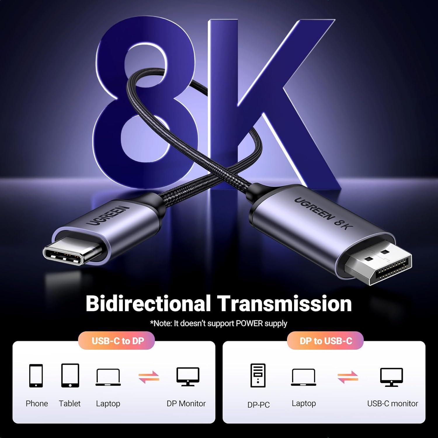 Bidirectional USB C to DisplayPort Cable: Bidirectional transmission from USB C to DP or from DP to USB C is supported, allowing one connection to flexibly meet two needs. The UGREEN USB C to DisplayPort 1.4 cable supports up to 8K@60Hz resolution (backward supports 4K@240Hz, 2K@360Hz). Plug and play with no need for a driver or software to enjoy bigger visual experience. *Note: It doesn't support power supply. So please connect extra power if using portable monitor or VR headset