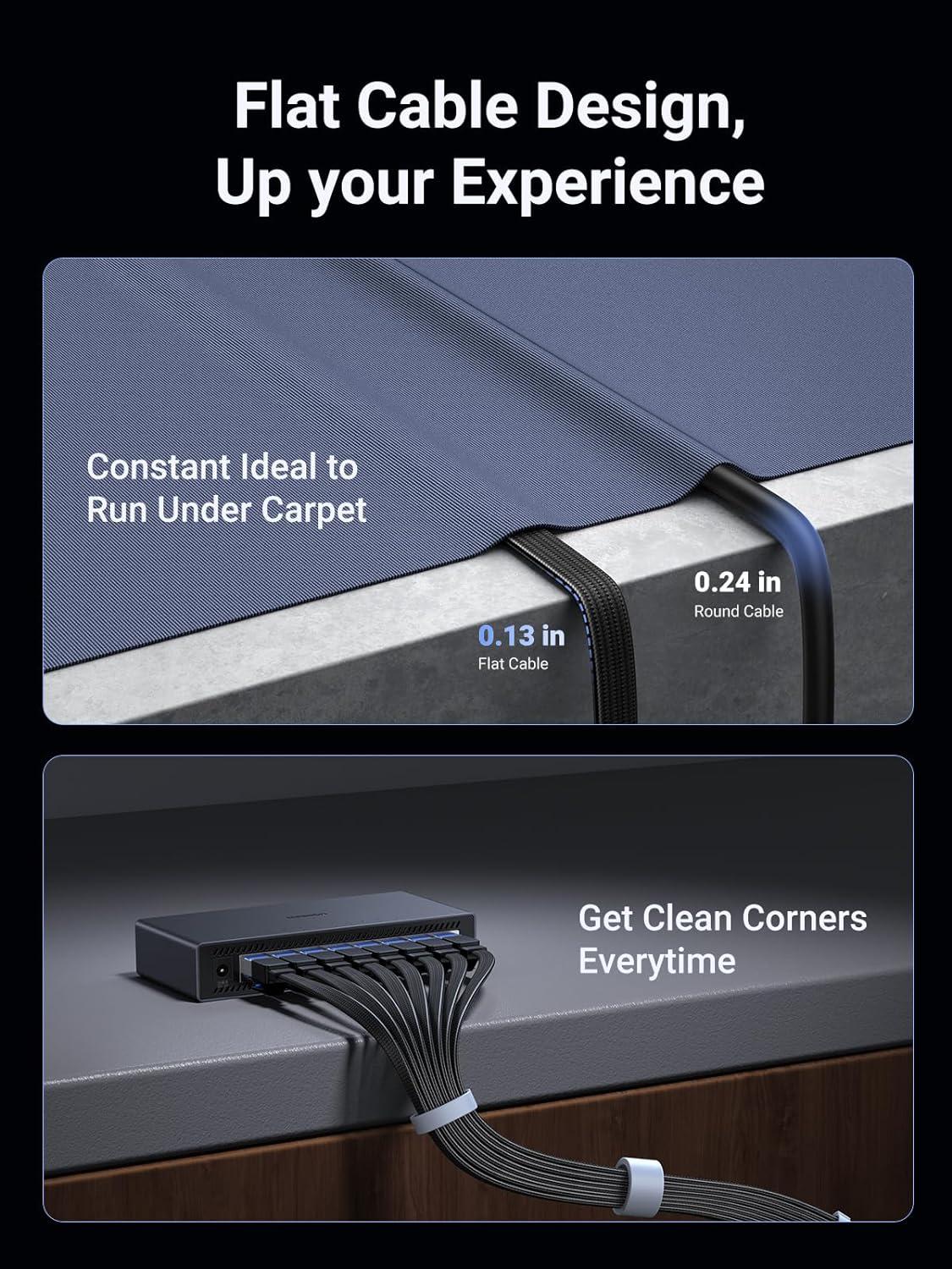 Flexible Flat Design: UGREEN Cat 8 Flat Ethernet cable adopts a unique flat and thin design, which allows for a cleaner and safer installation. Whether you want to install it under the door, through the window, or hidden under the carpet, it can be done very easily. It's very suitable for indoor wiring.