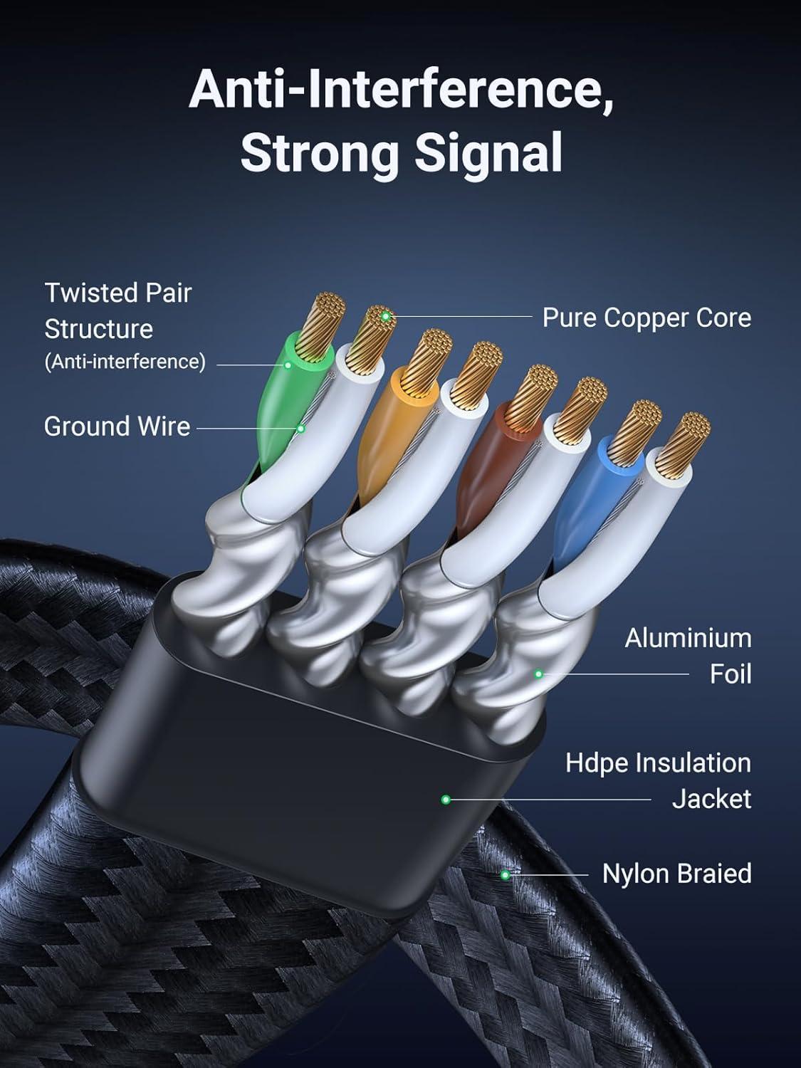Excellent Anti-interference: UGREEN Gigabit Cat 8 ethernet cable are designed with 4 shielded foiled twisted pairs (U/FTP), 26AWG pure copper core and gold-plated connectors. This design can greatly reduce interference and crosstalk from adjacent pairs and other cables, making network speed faster and more stable.
