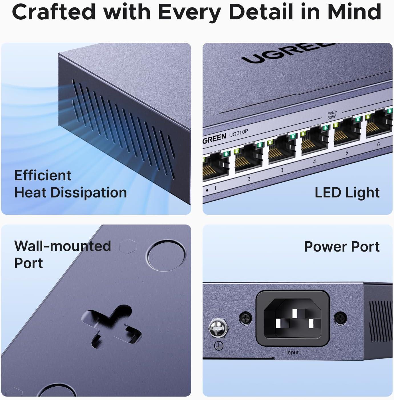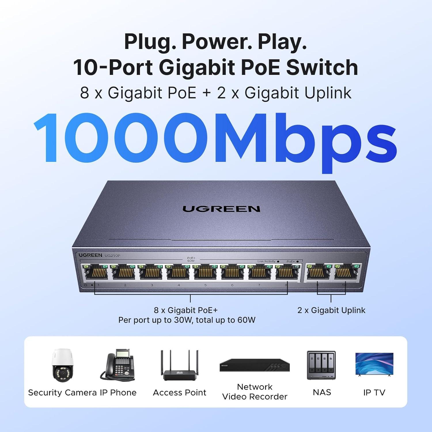 More Ports, PoE Ready: UGREEN ethernet switch offers 8 PoE+ (802.3at/af) Gigabit ports (up to 30W each) and 2 Gigabit uplink ports, with a total power budget of 60W. Ideal for efficient power delivery and seamless network connectivity