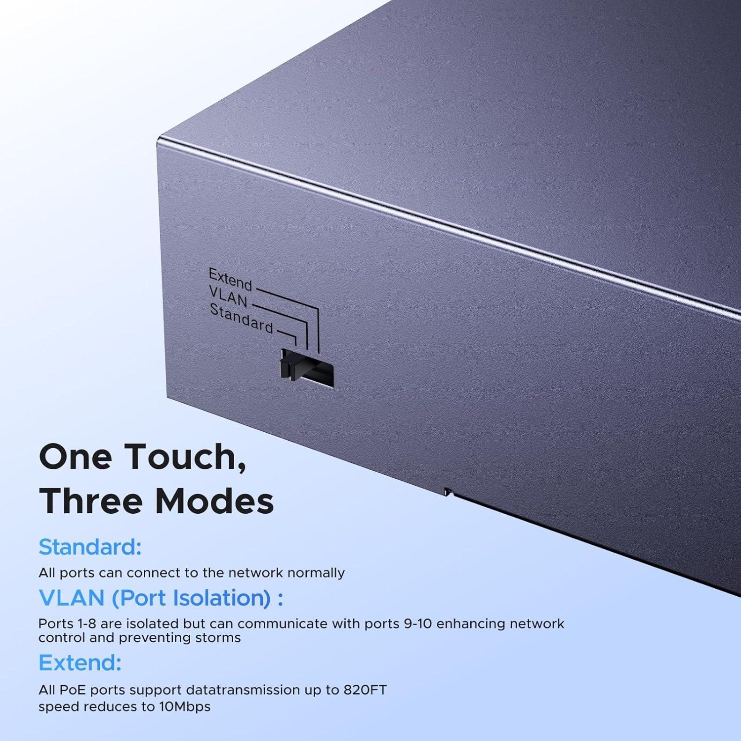 One Touch, Three Modes: The ethernet hub can easily switch between Standard, VLAN, and Extend modes. VLAN isolates ports 1-8 for better management and storm prevention. Extend mode supports PoE up to 820FT, ideal for security and remote network coverage