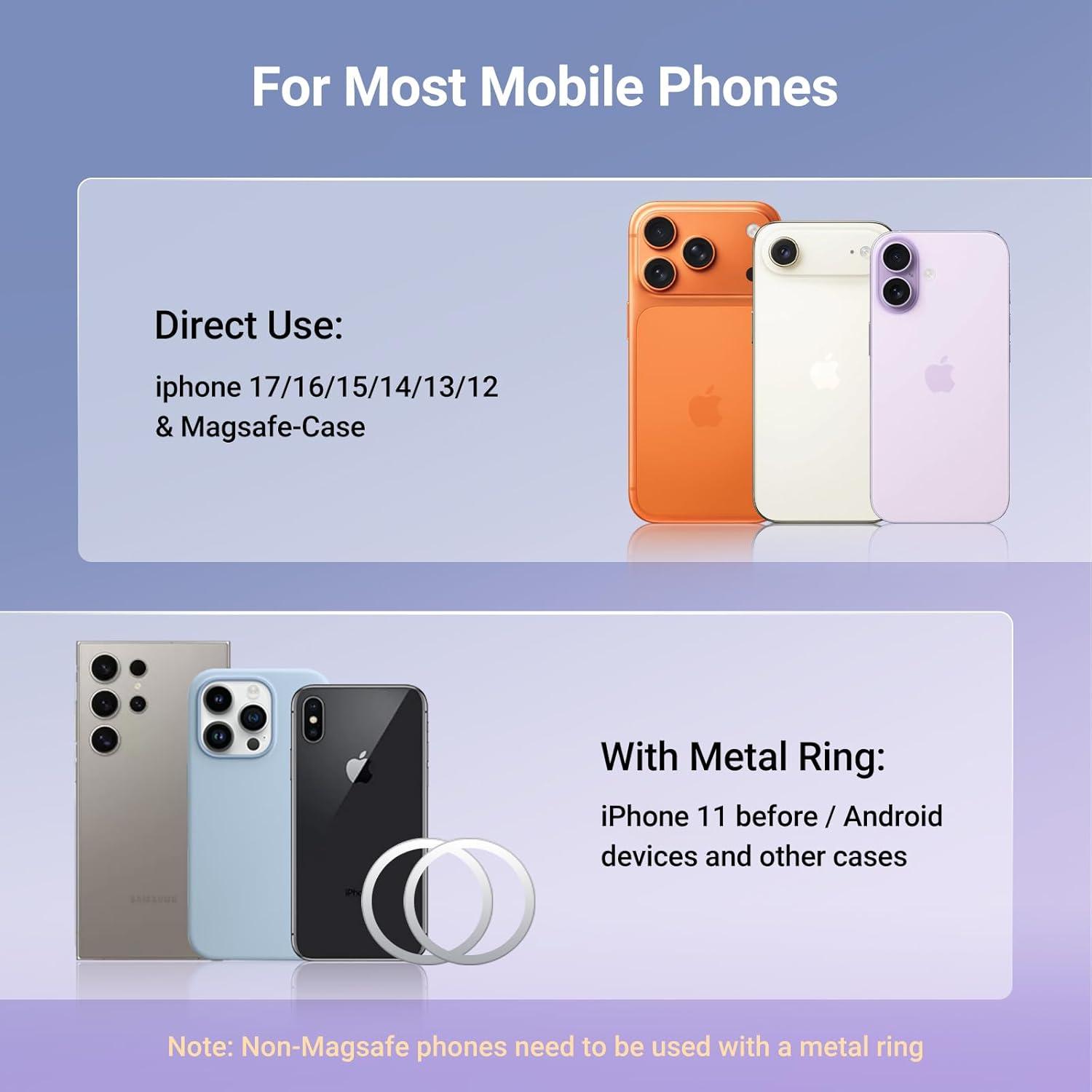 Widely Compatibility: The car phone mount is directly compatible for iPhone 17 16 15 14 13 12 pro max mini smartphone and original official MagSafe case. With extra metal rings, you can also use the iphone car mount with other android phone
