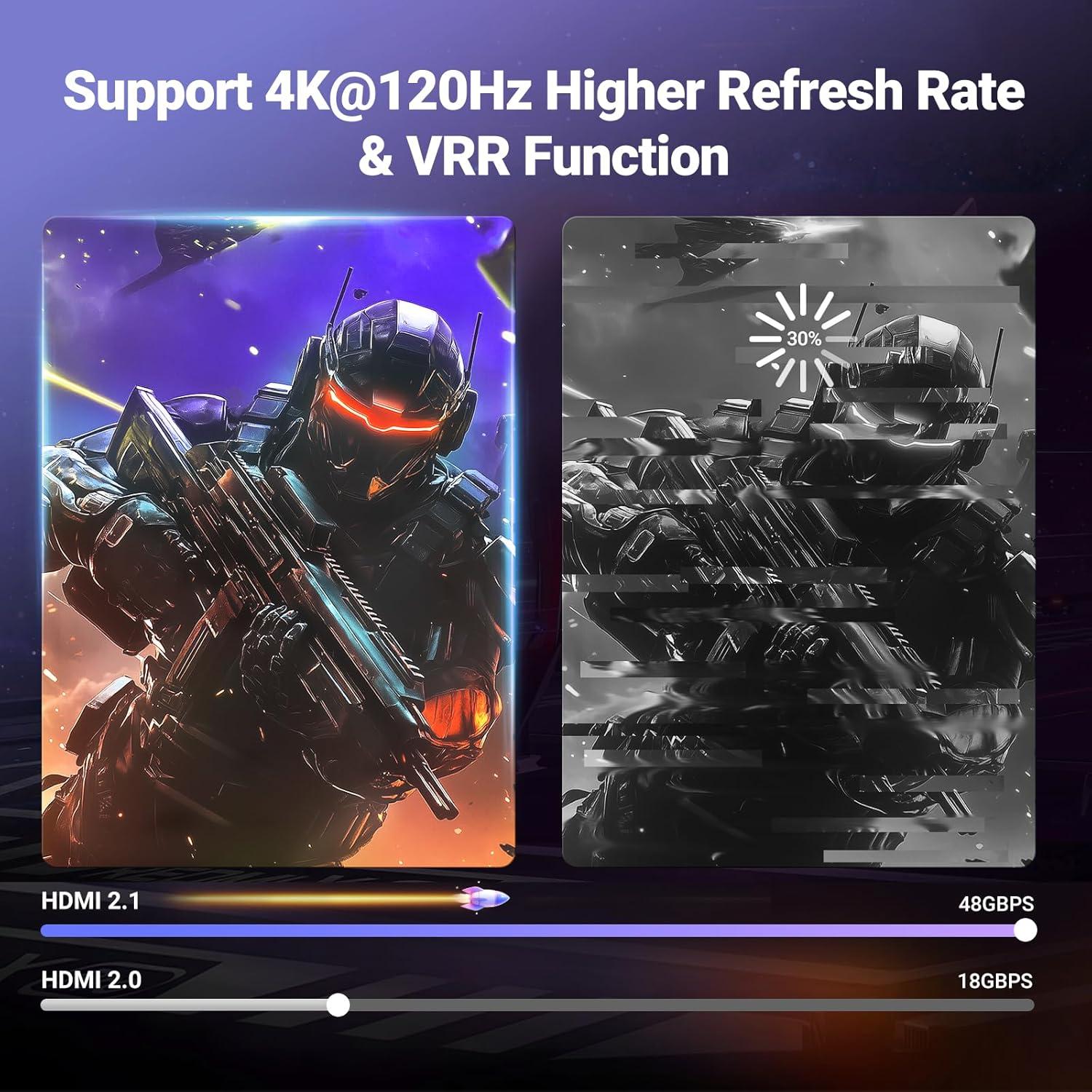 Higher Refresh Rate: Supporting a high refresh rate of 8K@60Hz, this HDMI switch with remote provides high bandwidth up to 48Gbps data transmission, allowing you to enjoy fluid, high-quality visuals during intense gaming sessions or fast-paced action movies. It also supports VRR and ALLM, which allows PS5 compatible with the frame quality of games better, making the game smoother and clearer, and enjoying a low-latency gaming experience