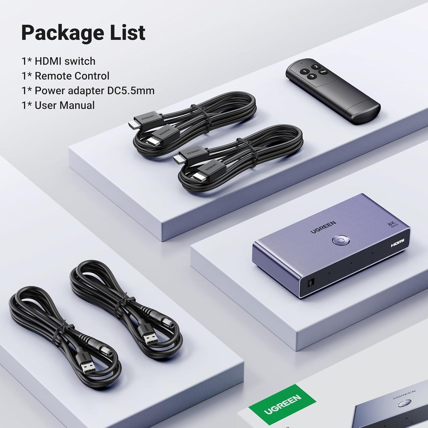 HDMI 2.1 Switch 3 in 1 out: This HDMI splitter supports connecting 3 HDMI sources to 1 HDMI display, keeping all your HDMI equipment relevant & useful. It eliminates the hassle of unplugging and reconnecting cables and helps decrease wear and tear & extends the lifespan of your gear. Note: This UGREEN HDMI Switcher DOES NOT work from a single source to multi monitors. USB A to DC Power Cable(5V/1A) is Included, But HDMI cables and Power Adapter are NOT Included