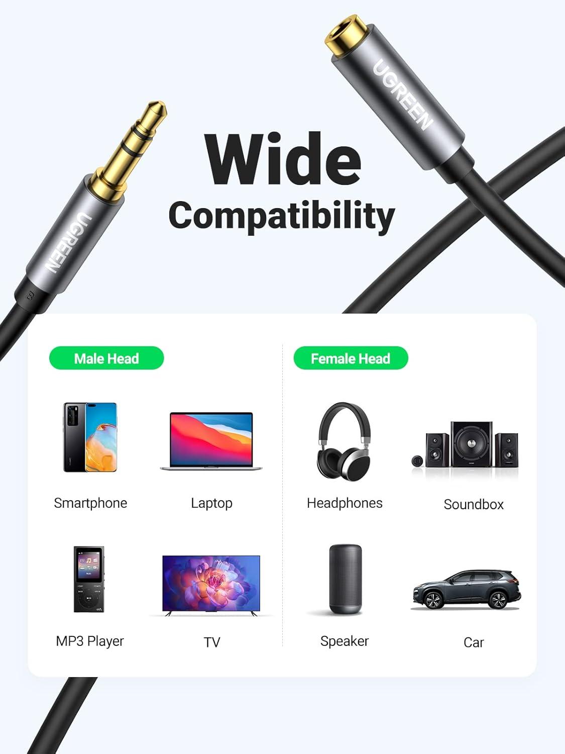 Protect Your Aux Port: UGREEN 3.5mm extension cable is a great solution to protect your 3.5mm port from repeat plugging and unplugging. It is costly to buy a new device, while it is so easy to get a aux extension cable