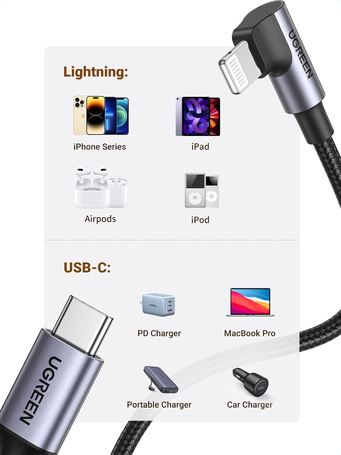Universal Compatibility: UGREEN USB-C to Lightning Cable supports fast charging for iPhone 14 and other series, such as iPhone 13/12/11 series, iPhone X series, iPhone 8 series, and AirPods; Standard Charging Speed works with iPhone 7 Plus/7/6, iPad Mini 4/3/2, iPad Air, iPad 9, iPod touch 6, etc