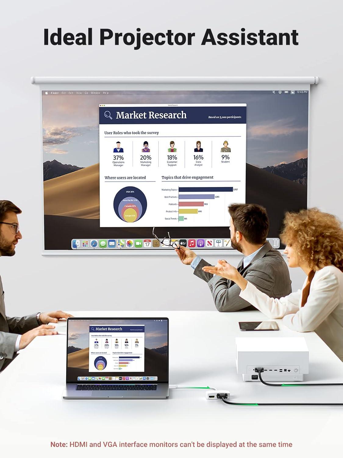 Mini DP to HDMI and VGA Adapter: This UGREEN mini DisplayPort is used to connect the equipment with the Mini DisplayPort to an HDTV, display, monitor, and projector equipped with an HDMI port or VGA port. With the help of this thunderbolt 2 adapter, you can enjoy high-definition video and images on your large-screen display. Note: HDMI and VGA ports can't be used simultaneously