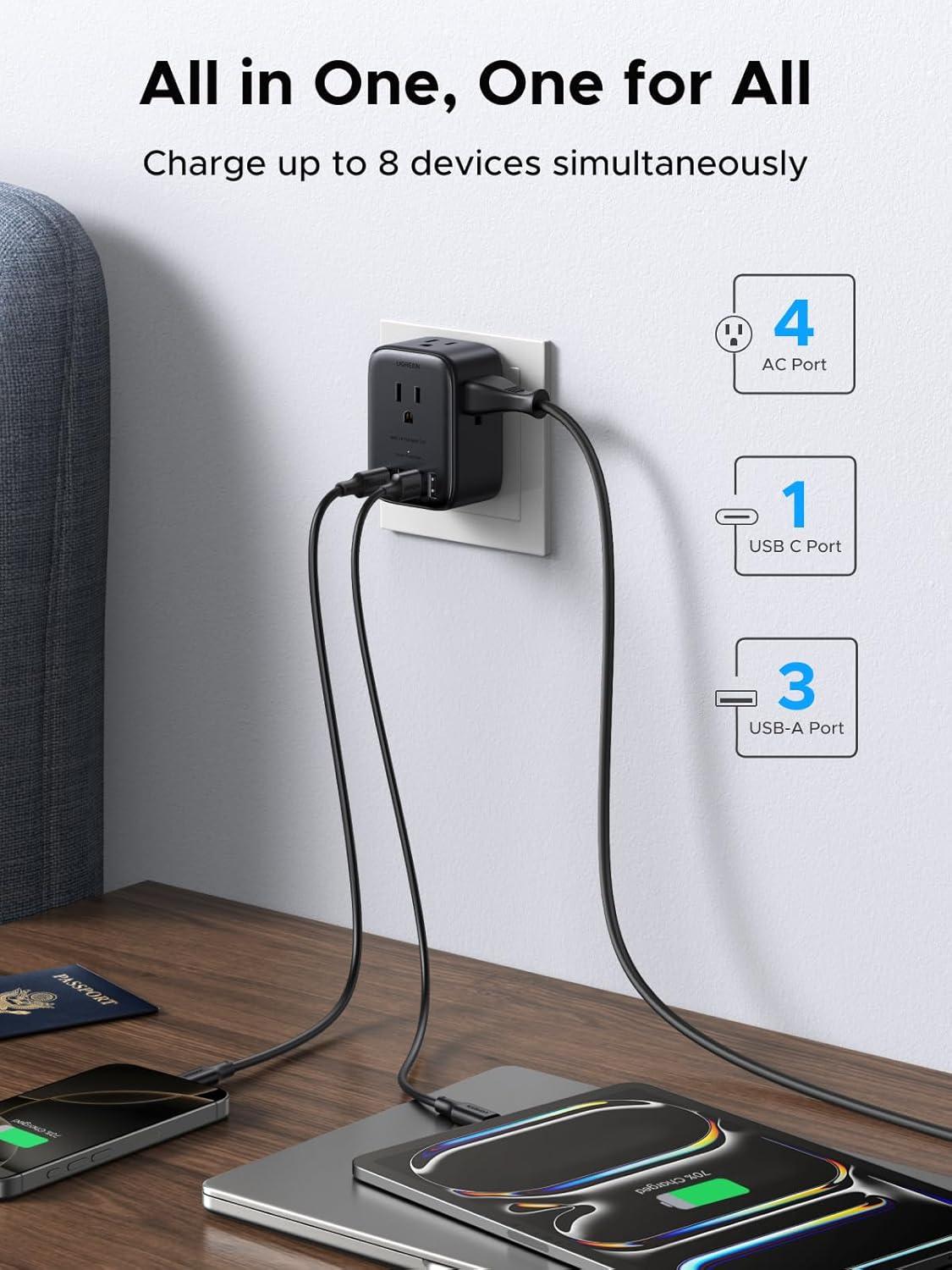 All You Need is Here: Easily power up to 8 devices at once with this compact power strip, featuring 4 widely spaced AC outlets and 4 USB ports (including 1 USB-C). Perfect for your home office, bedside, dorm, or travel setup. No more outlet battles or bulky chargers—just simple, efficient charging.