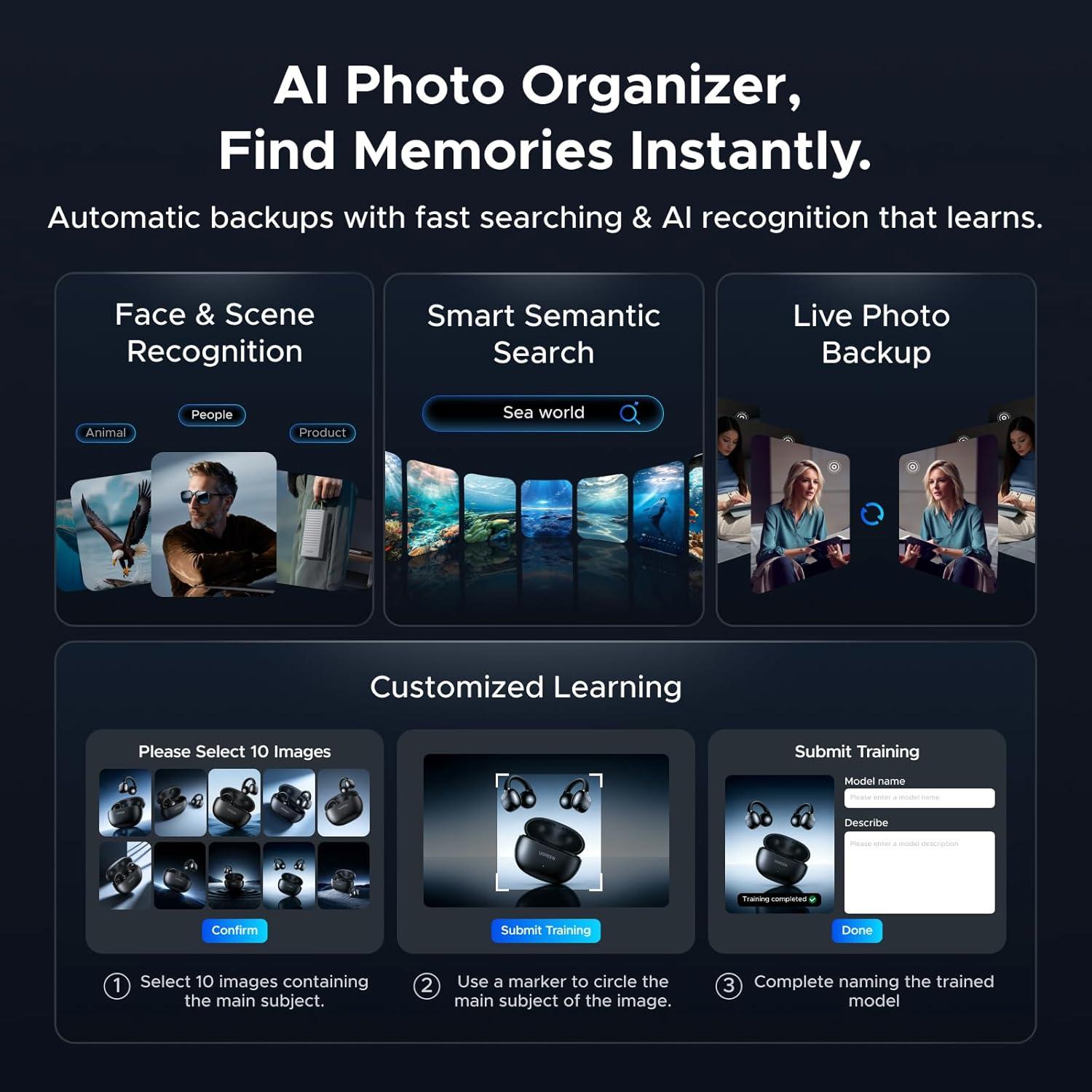 AI-Powered Photo Album: Automatically organizes your photos by recognizing faces, scenes, objects, and locations. It can also instantly remove duplicates, freeing up storage space and saving you time.