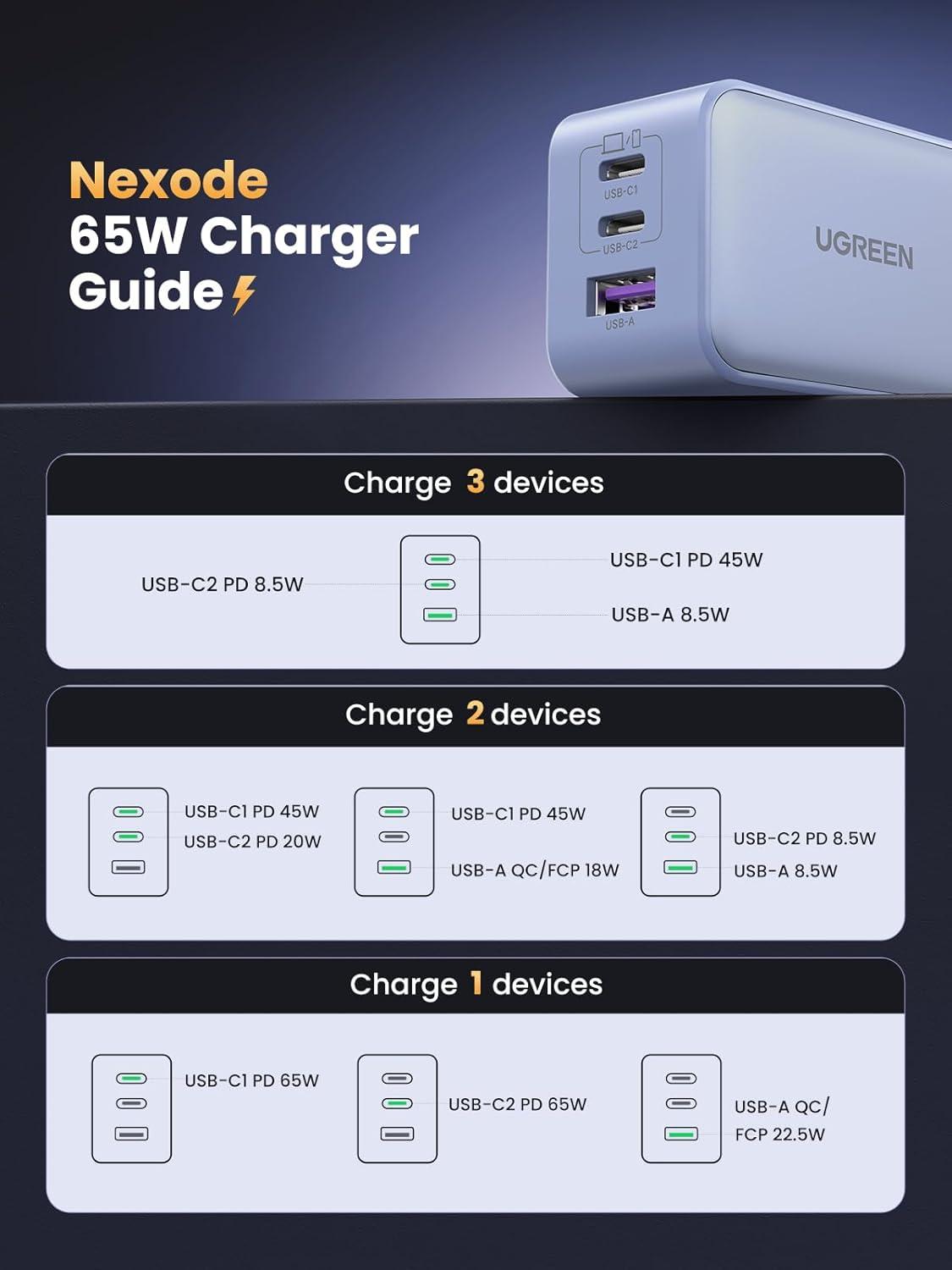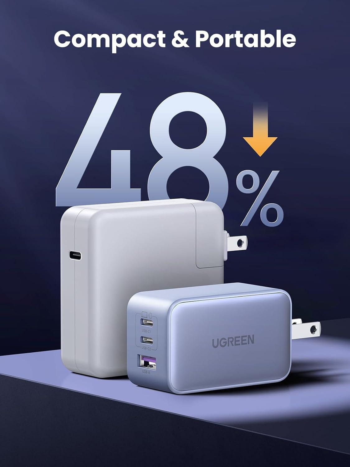 Travel Friendly, Compact Design: Thanks to a cutting edge GaN chip, Ugreen's 65W USB C charger is 50% smaller than the original 61W USB C charger; A foldable plug provides more portability and a better travel experience