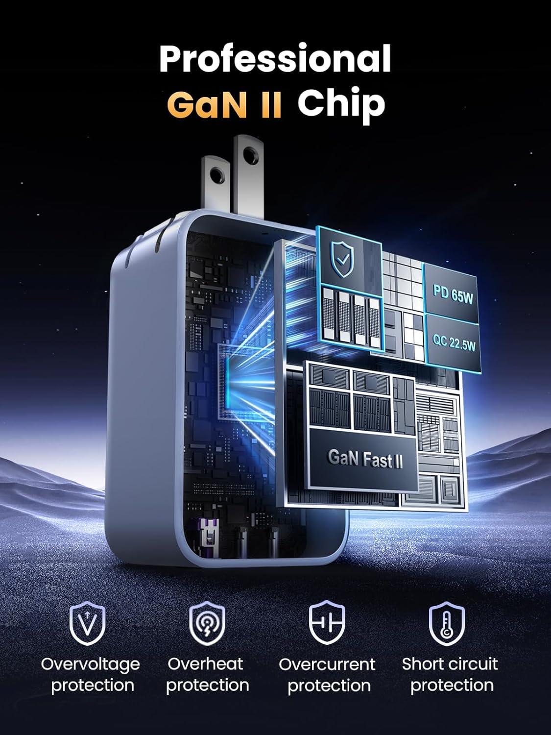 Adopted GaN Safety & Efficiency: Utilizing GaN technology, this 65W power adapter provides safe, cooler charging to protect your devices while optimizing energy usage