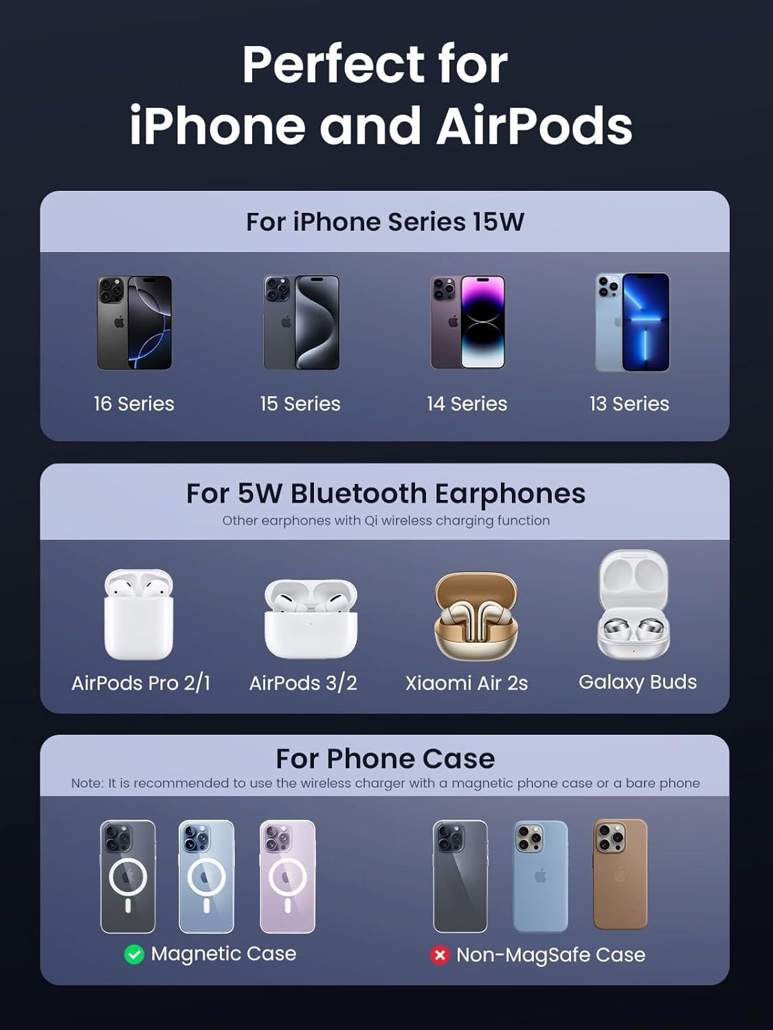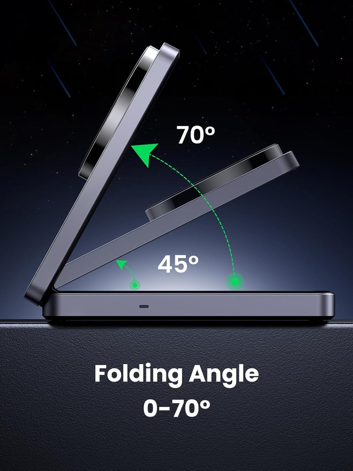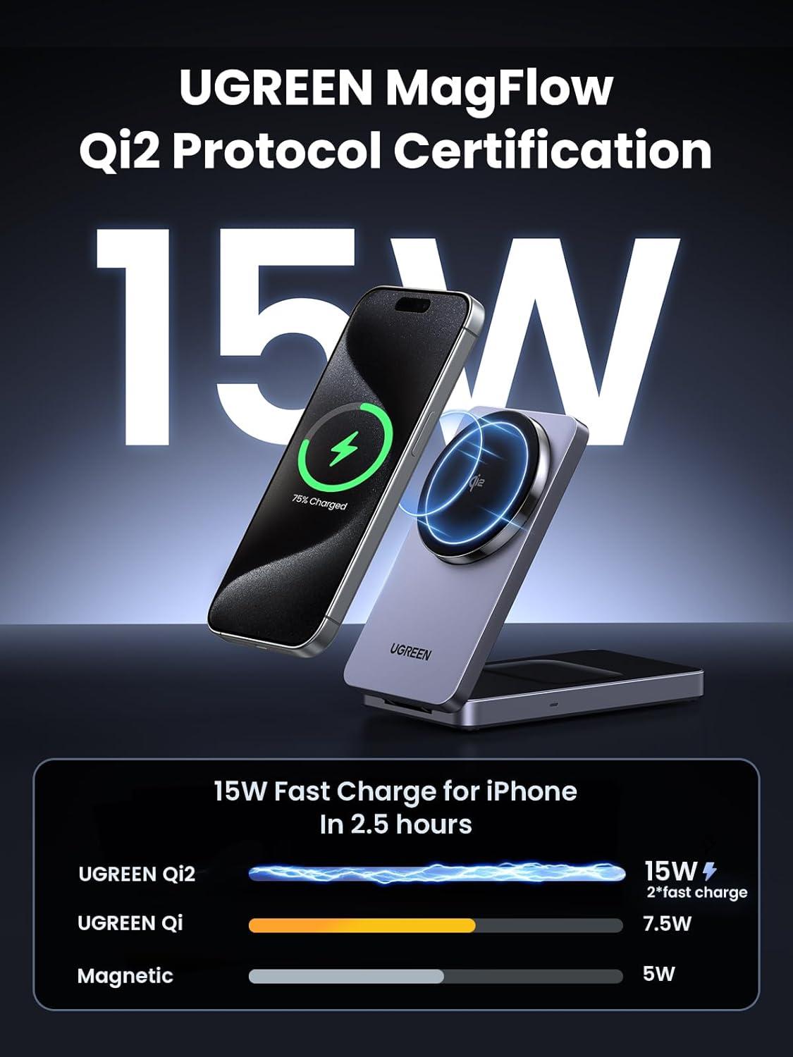 UGREEN Qi2 15W MagFlow Wireless Charger, 2-in-1 MagSafe Fast Charging Station, Foldable Charger Stand for iPhone 17/16/15/14/13/12 Series, AirPods 4/3/2/Pro, with a 3.3FT USB C Charging Cable