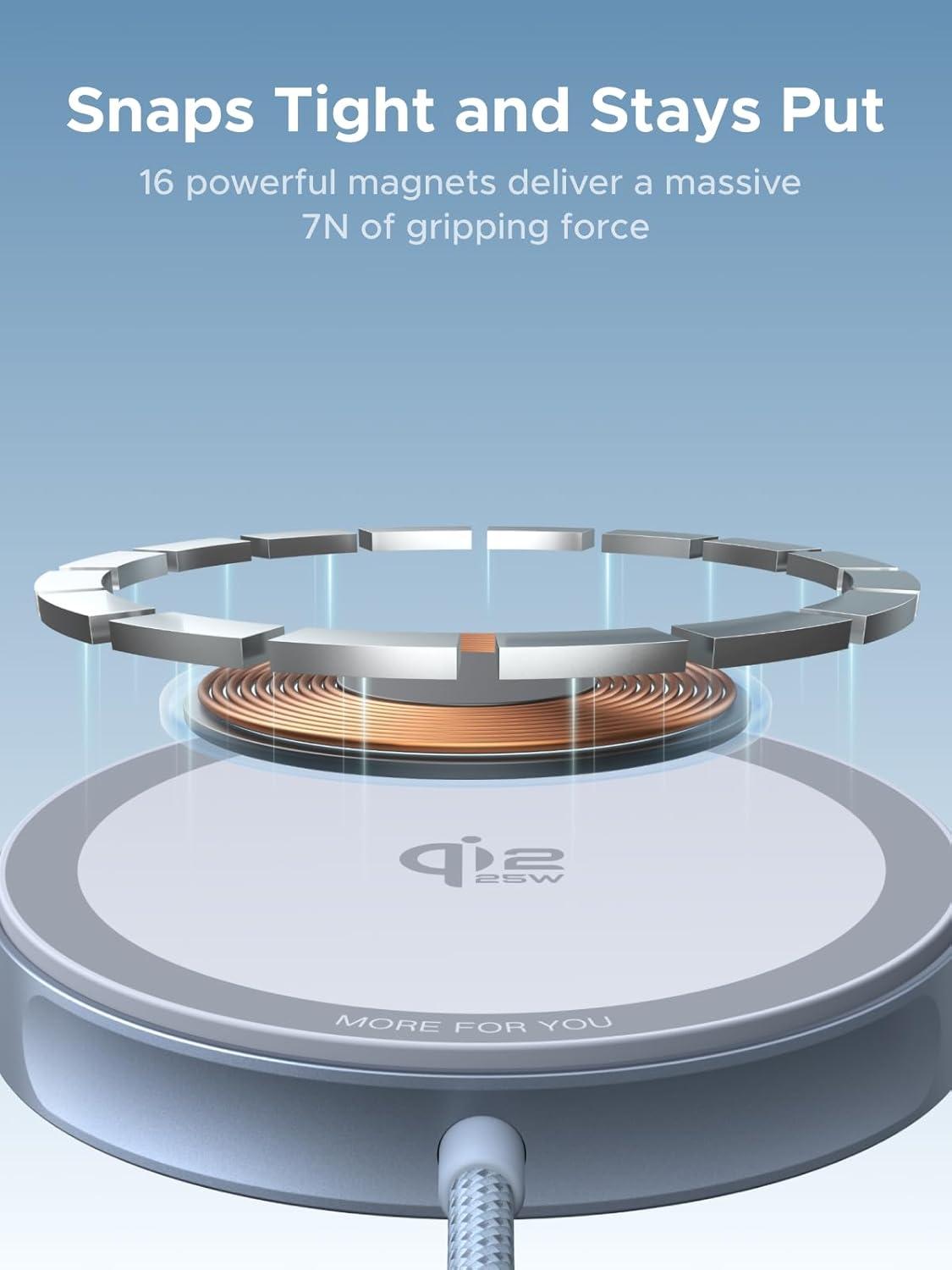 Efficient & Safe Wireless Charging: This MagSafe Pad charger provides Qi2 25W charging for iPhone, 5W for AirPods (with MagSafe case), eliminating unnecessary cables for a clean and organized desktop. It offers protection against over-voltage, over-current, overheating, short circuit and foreign object detection (FOD)