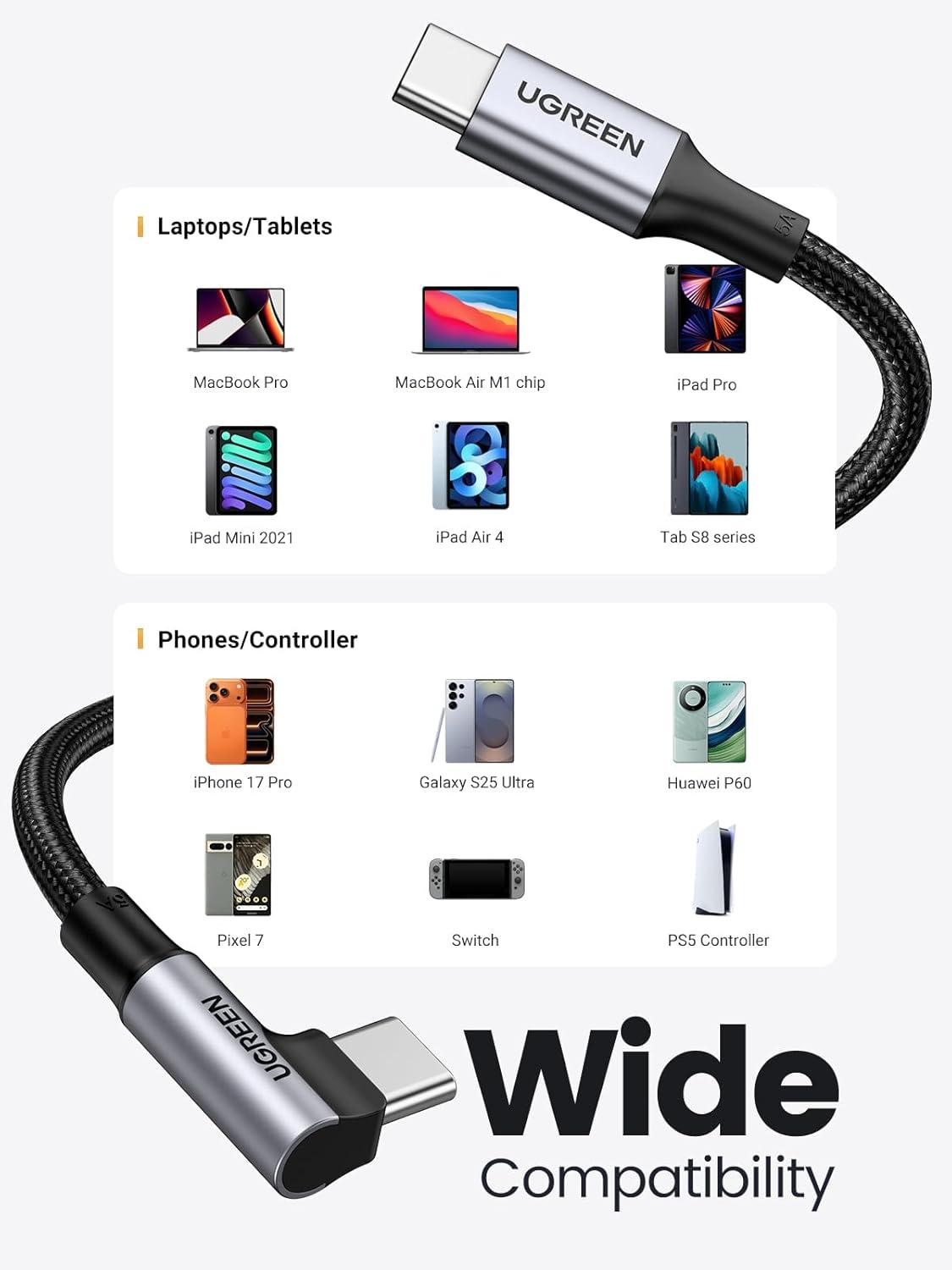Broad Compatibility: This UGREEN type C to type C cable is compatible with USB-C devices, such as iPhone 15/15 Plus/15 Pro/15 Pro Max, Macbook, iPad, Google Pixel, Samsung Galaxy S24/S23/Note 20/Note 10+ and etc