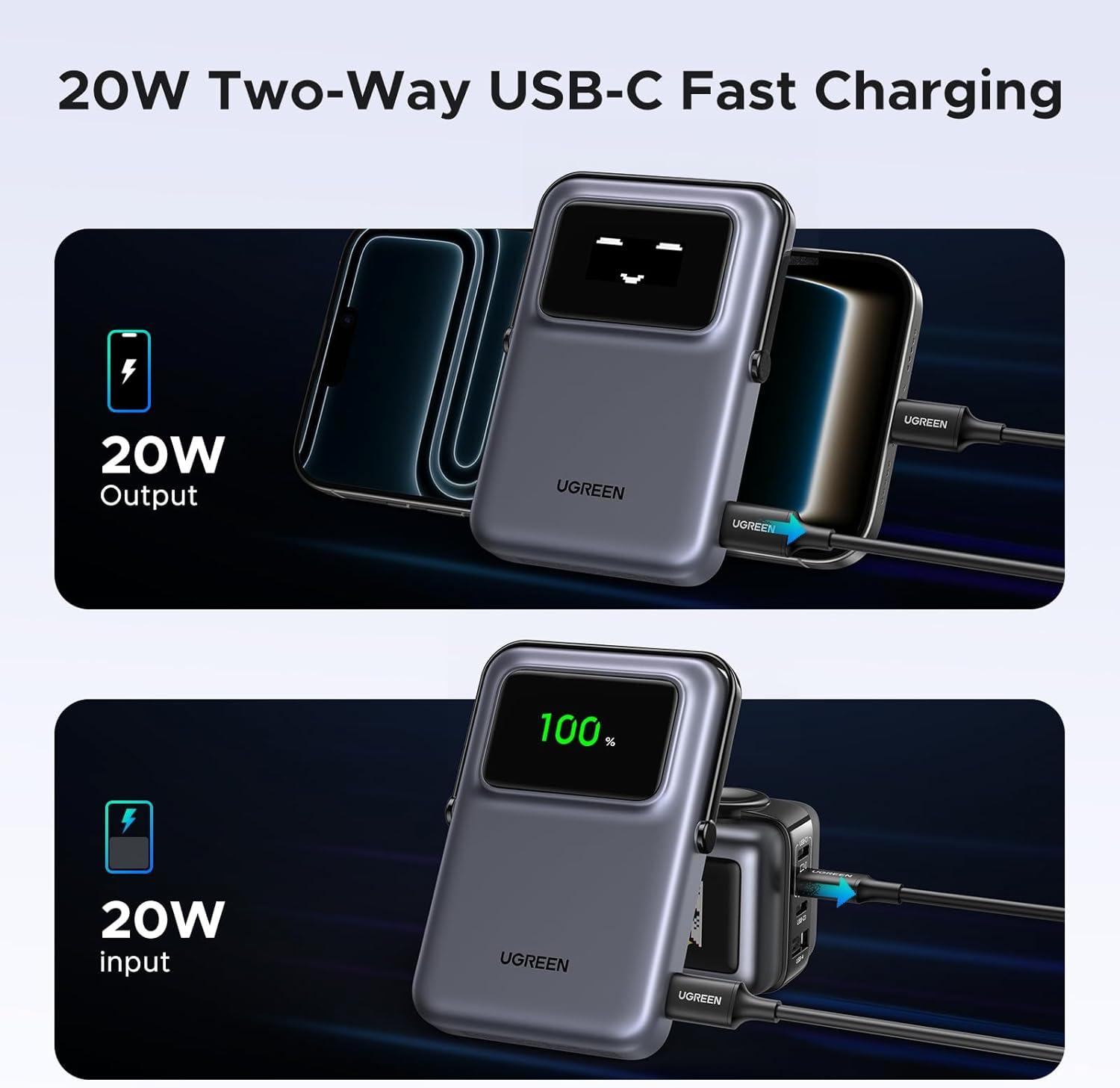 Wireless and Wired Charging: Ugreen battery bank offers 7.5W magnetic charging, while also supporting PD 20W wired charging. It combines convenience and power to ensure you can power two devices at the same time