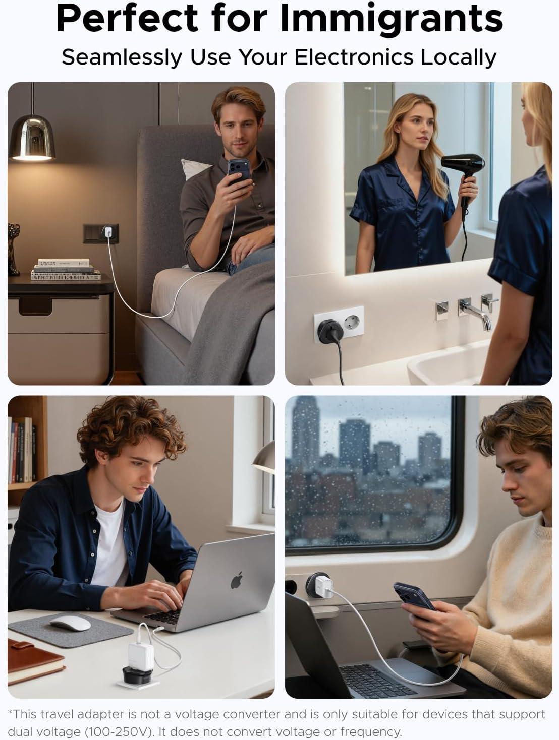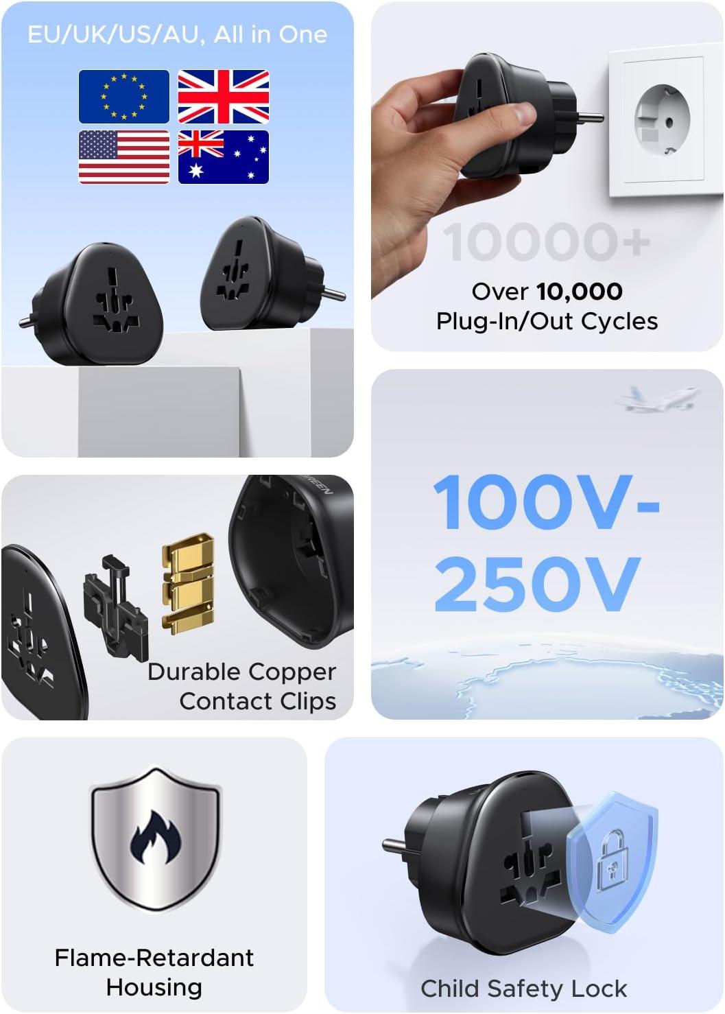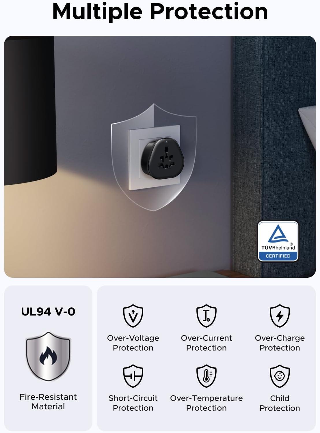 Full Safety Adapter: This converter is TUV-certified for safety and built with a UL94 V-0 high-standard flame-retardant housing that’s both durable and secure. It offers multiple safety protections, including over-voltage, over-current, over-charge, short-circuit, and over-heat protection, plus a child-safety lock, providing thoughtful protection for you and your devices