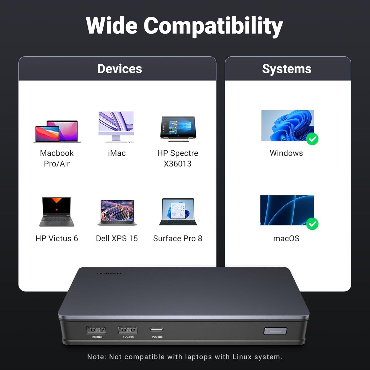 Muilt-Extended Modes for macOS: Boost your work efficiency with the UGREEN USB C Docking Station's DisplayLink Technology to extend dual 4K@60Hz monitors for macOS and Windows systems. Choose between extended or mirrored display modes effortlessly. (Driver installation required for display and network functions)