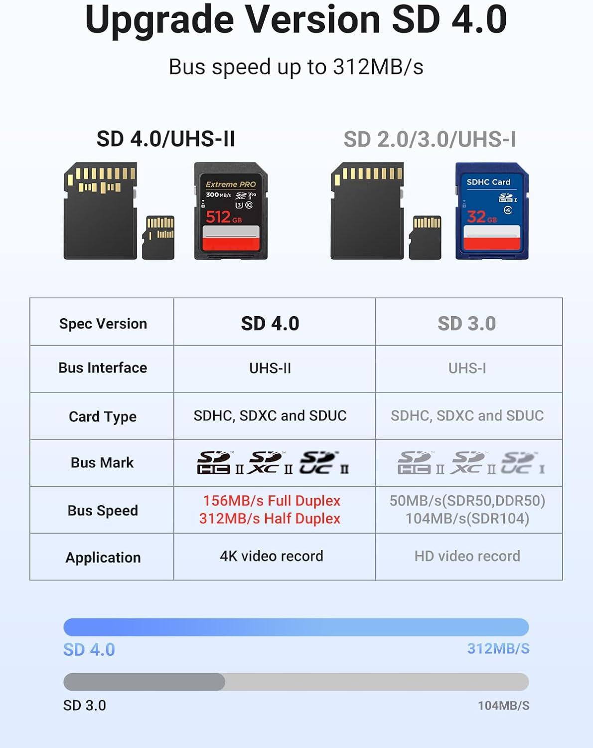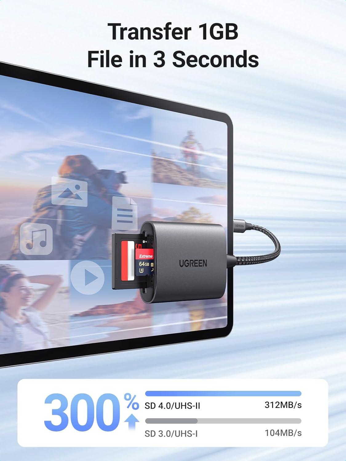 SD 4.0 312MB/s High Speed: UGREEN USB C 4.0 SD Card Reader supports the latest SD 4.0 UHS-II memory cards and can transfer data such as 4K movies, photos, and video Vlogs at high speeds of up to 312MB/s. Three times faster than ordinary USH-I card readers