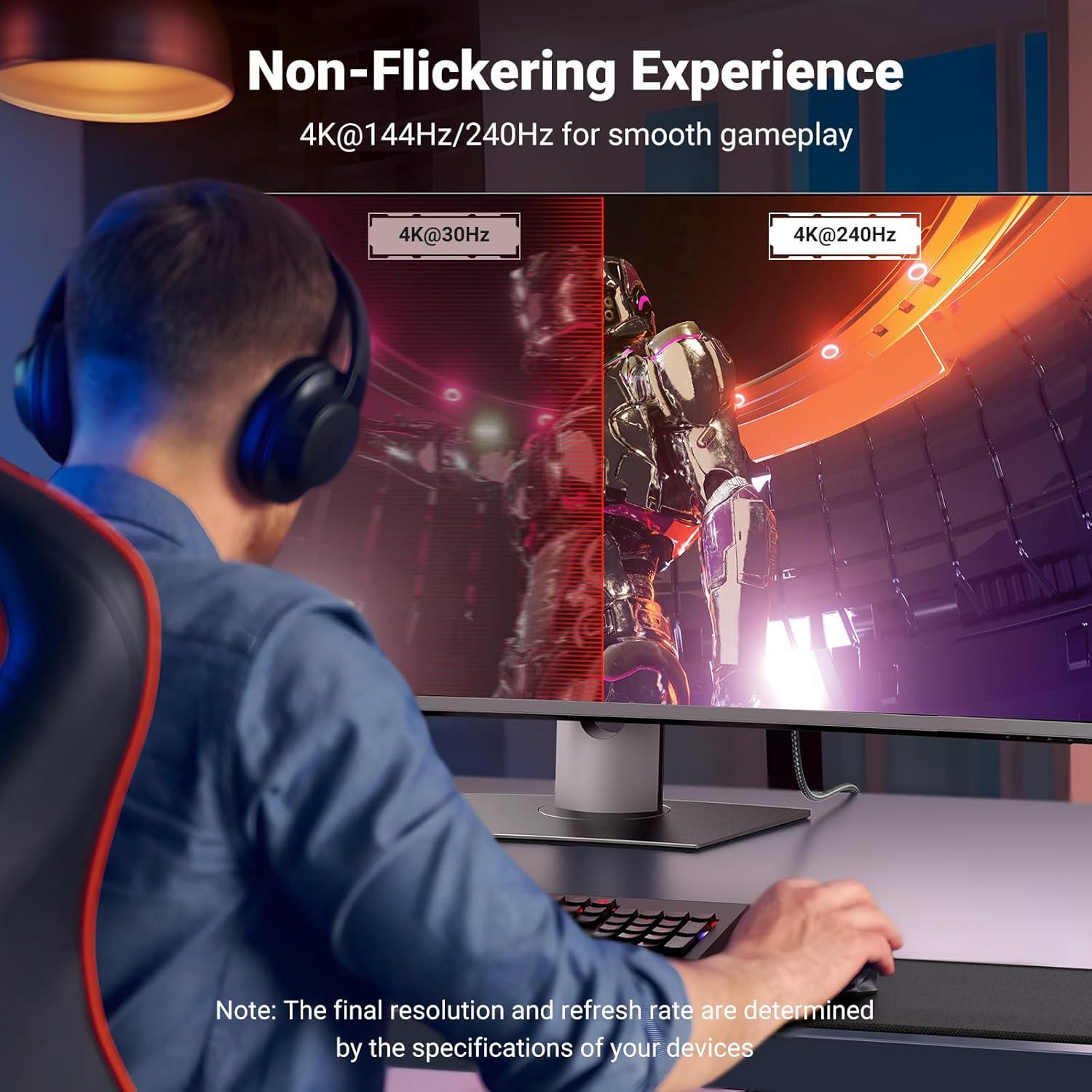 Displayport 1.4 Enhanced Transmission: The DP 1.4 version transmits data at speeds of up to 32.4Gbps and 240Hz. With stable signal transmission,the cable can ensure amazing sound and image quality, and an end to screen flickering. It supports HDCP2.3, VRR and ALLM which brings you a smoother gaming experience. It also supports flawless audio including eARC, DTS, and Dolby. Note: We advise connecting USB C source to DP display directly to avoid display errors rather than via docking or hub due to hardware limitations