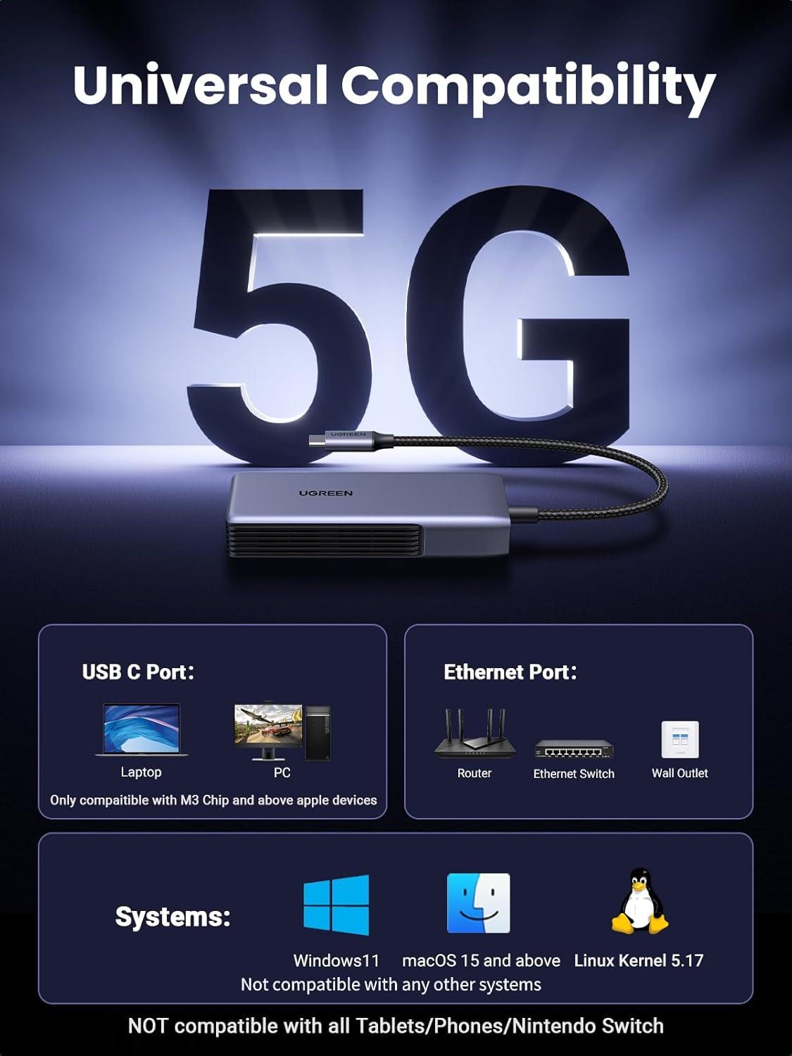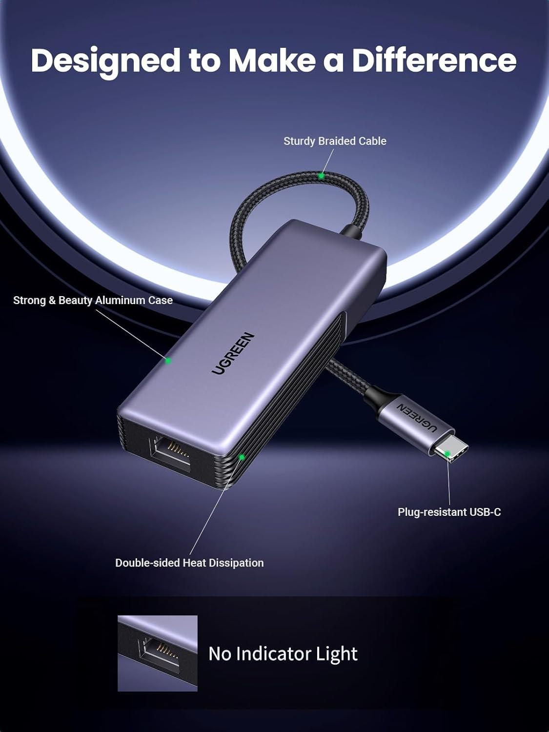 5Gb, Redefining Ethernet Adapter: UGREEN usb c to ethernet adapter with powerful 5Gb performance. Lightning-fast wired connection helps increase data transfer speed by 400% compared to Gigabit. Enjoy fast downloads with NAS and efficient content creation (To achieve 5Gb, please use a CAT6 or higher cable. And ensure your router, ethernet switch, or server support 5Gb ethernet and your device's port is complies with the USB 3.2 Gen2 (10Gbps) or higher.)