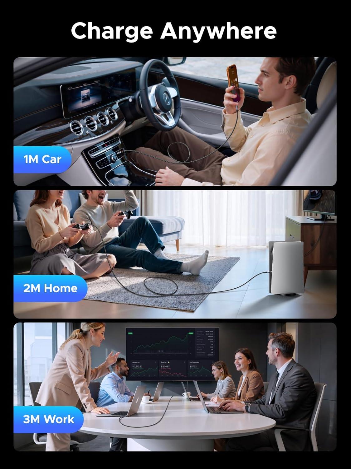 Flexible scenario adaptation: three sizes are available (1m for car, 2m for home, and 3m for conference projection), EMI certified and interference-free, compatible with Type-C devices such as iPhone 15-17 series, Samsung S25, and MacBook