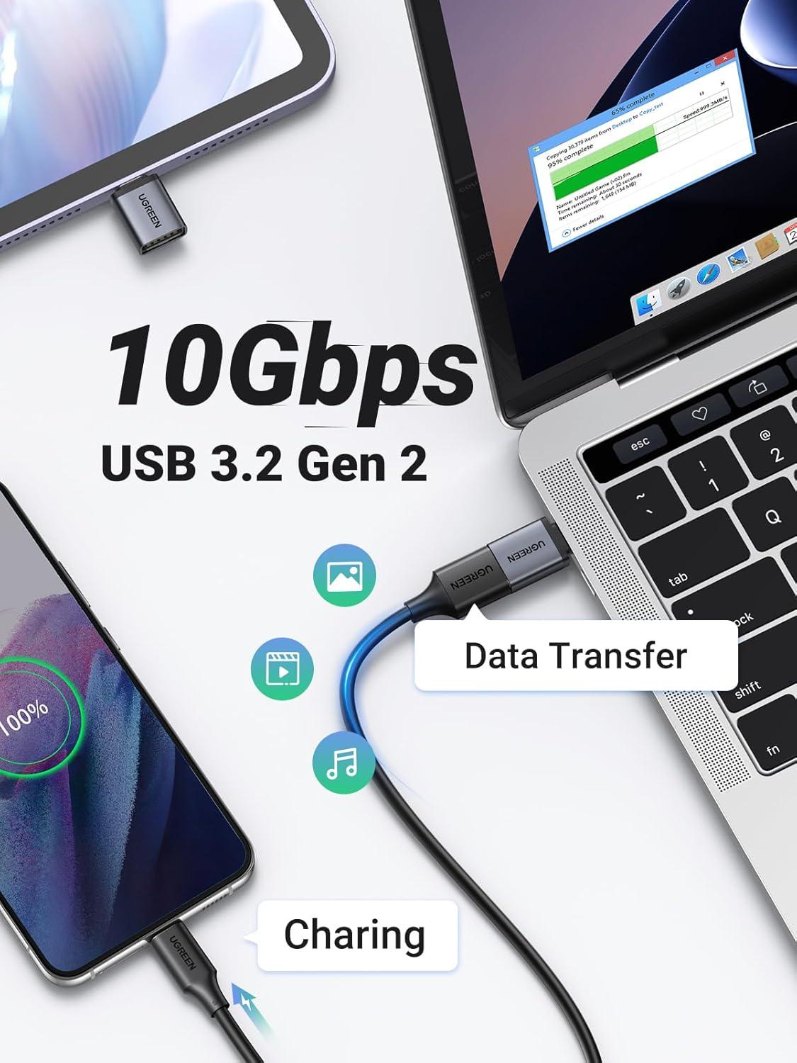 10Gbps Super Fast Data Transfer: The 10Gbps high-speed data transfer allows you to quickly transfer files via USB A Female to USB C Male Adapter in seconds. Note: To achieve 10Gbps speed, please make sure the connected devices support 10Gbps transmission speed, and the connected cable should be within 3.3FT