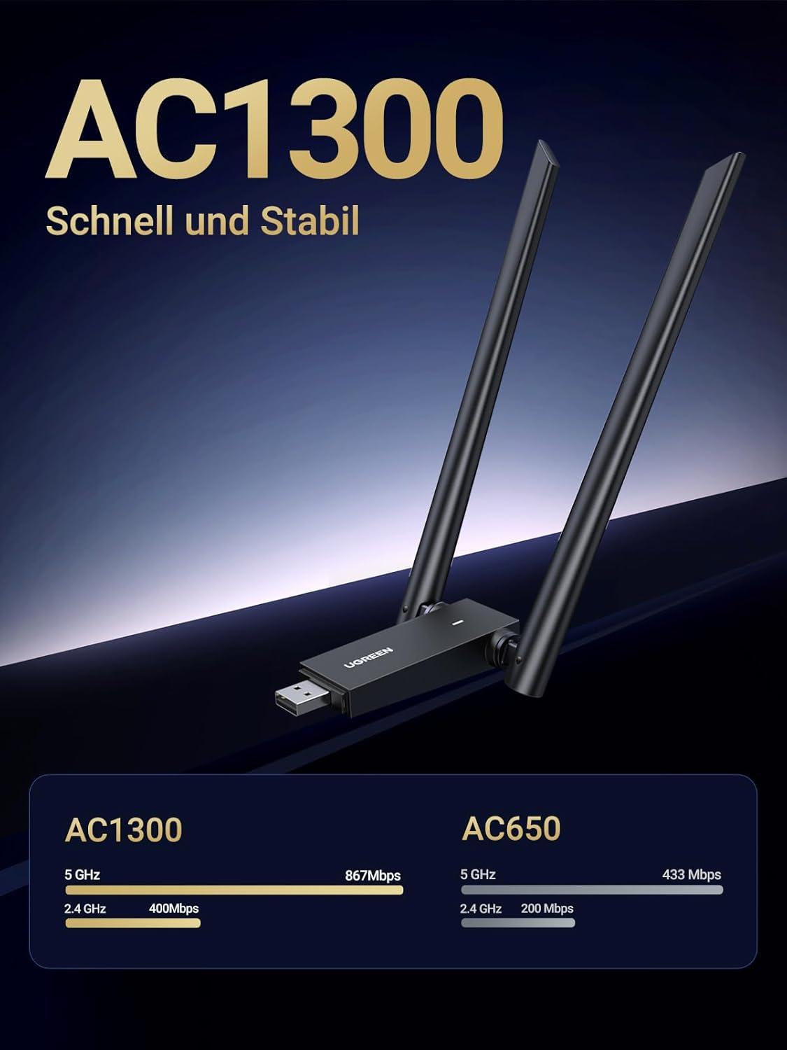 UGREEN USB WiFi Adapter, AC1300 5dBi High Gain Dual Antennas, 5G/2.4G Dual Band, 164ft Wide Range, USB 3.0 WiFi Adapter for Desktop PC Laptop, Support Windows 11/10/8.1/8/7