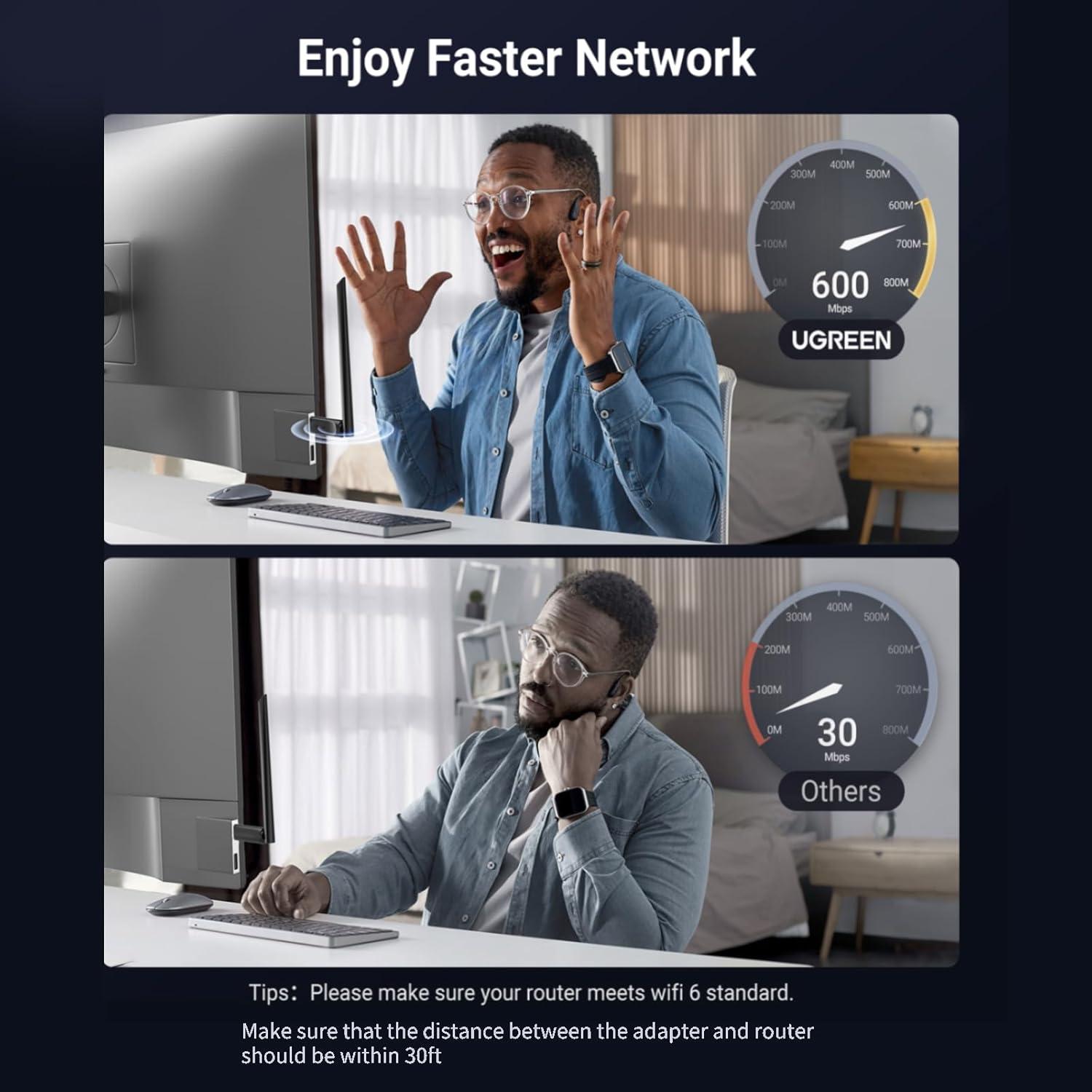 Wifi 6 High-speed Transmission: The usb WiFi Adapter supports the new generation of WiFi6 technology with transmission speeds of up to 600 Mbps on 5 GHz + 287 Mbps on 2.4 GHz, Note: Use WiFi 6 Router to achieve AX900 speed