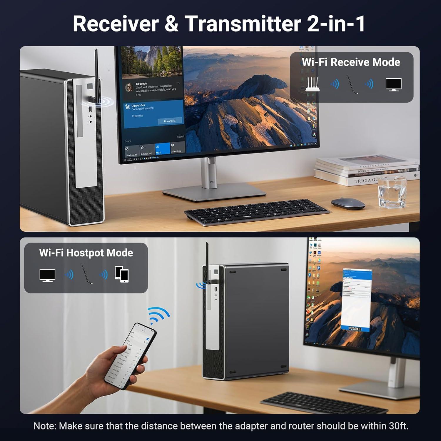 Receive & Transmit Two in One: A desktop PC can connect to the WiFi wireless Internet by connecting it to a wifi adapter. A networked computer can connect to the wifi dongle to transmit WiFi and share it with other devices