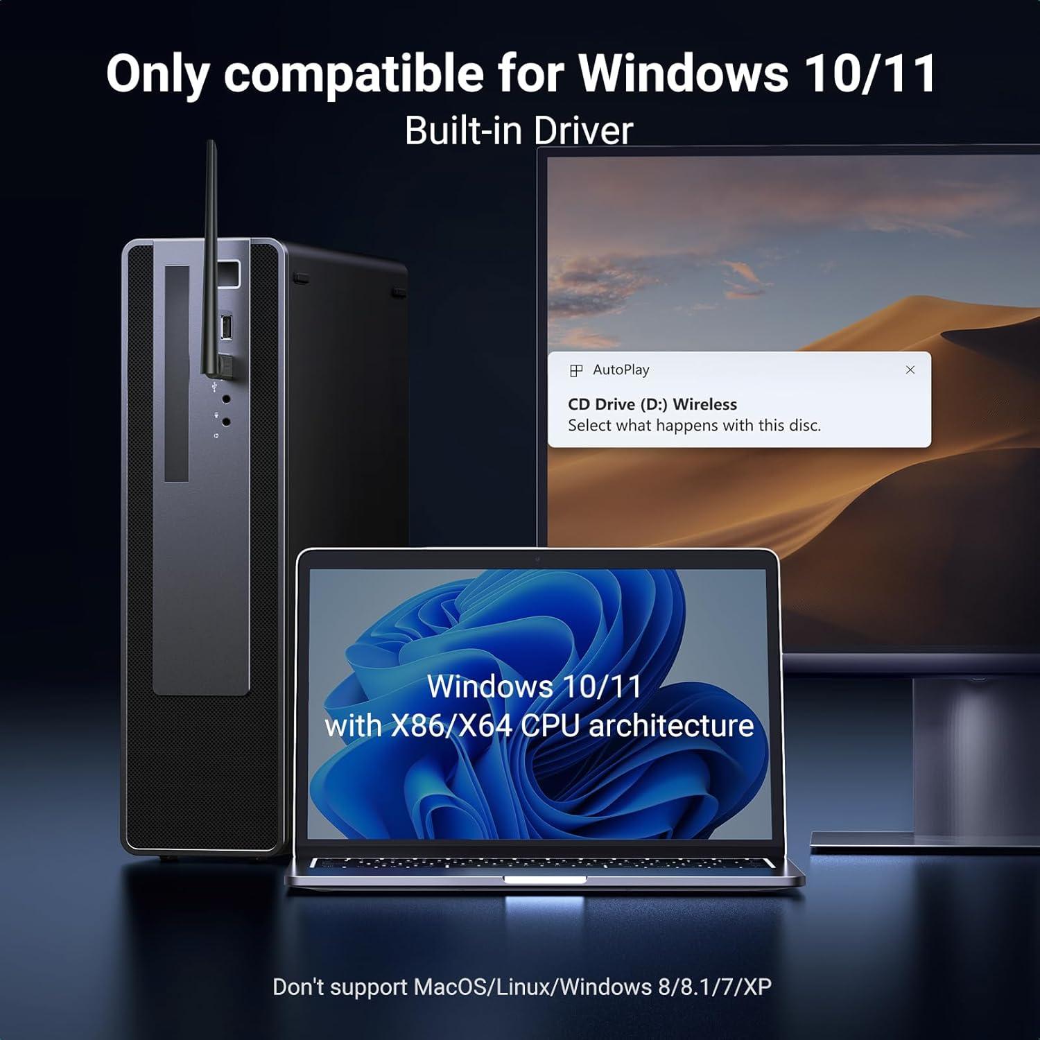 Built-in Driver: The pc wifi adapter supports Windows 10/11 with X86/X64 CPU architecture, which are built-in driver. Don't need to download drivers, saving time and worry. Please note this Adapter doesn't support MacOS/Linux/Win 8, 8.1, 7, XP